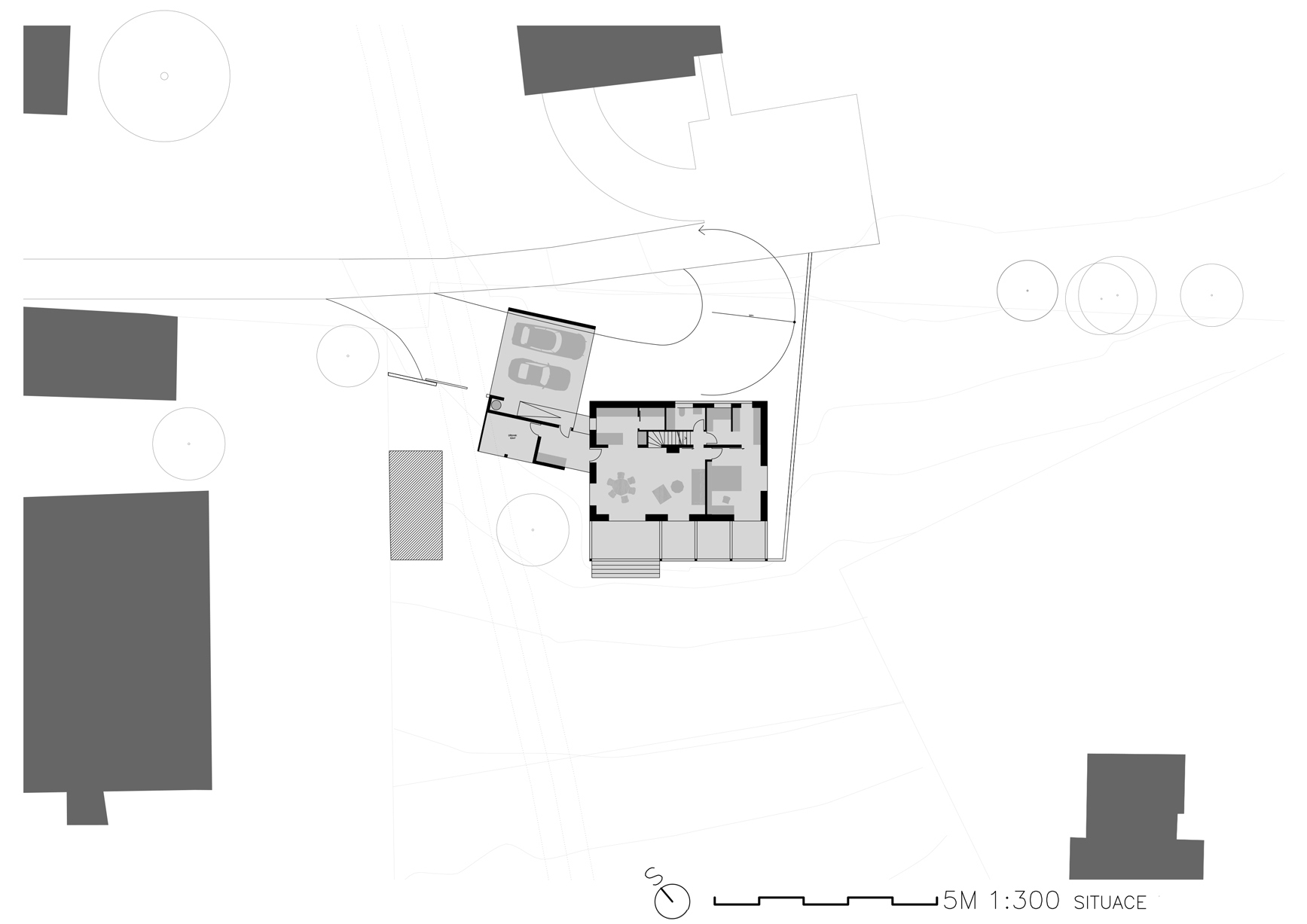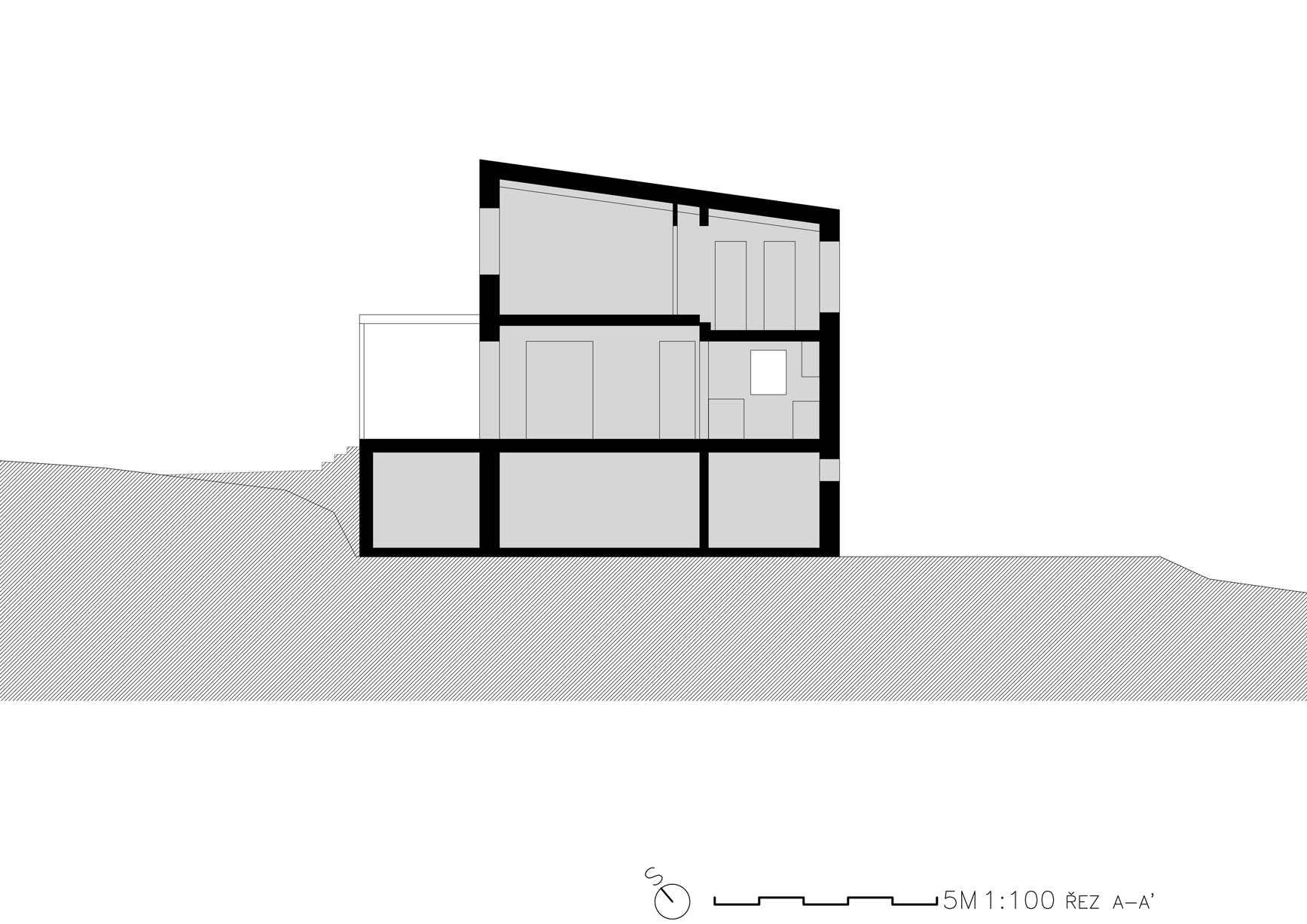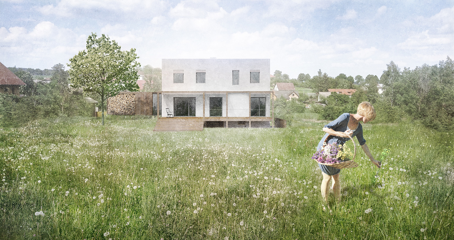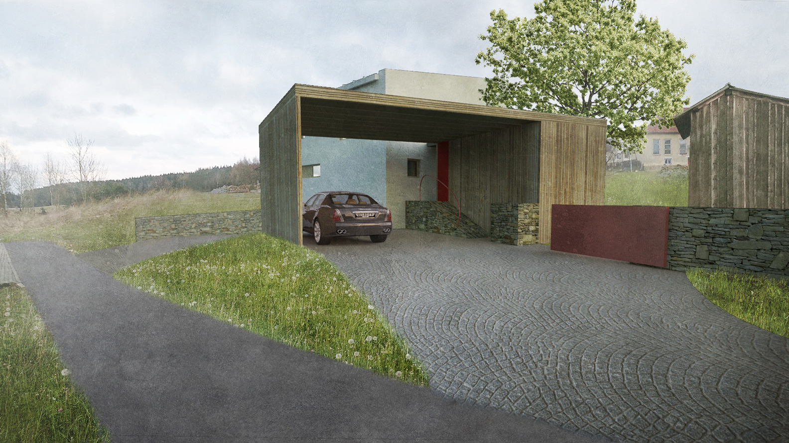 Pozemek obklopen několika domy, volno pouze nahoru do louky. Již se mělo stavět- před několika lety se vylily základy původně navrženého domu. Mladá rodina se rozhodla pro návrh nový, základy pokud možno využít! Uvízly však v podivné poloze- nová cesta která pod pozemkem vznikla, ubrala z terénu a propadla se výrazně pod úroveň základů, a přízemí nad suterénem vychází téměř metr nad zemí. Co s tím? Nakonec se vše obrátilo ve výhodu. Dům pod svahem se tak vzchopil vůči okolním domům. Vznikla obytná pavlač do zahrady- sala terrena. Pod ní sklípek. Dům z venku i zevnitř přejímá motiv svahu.