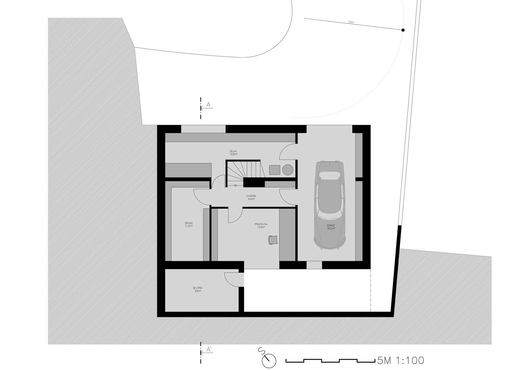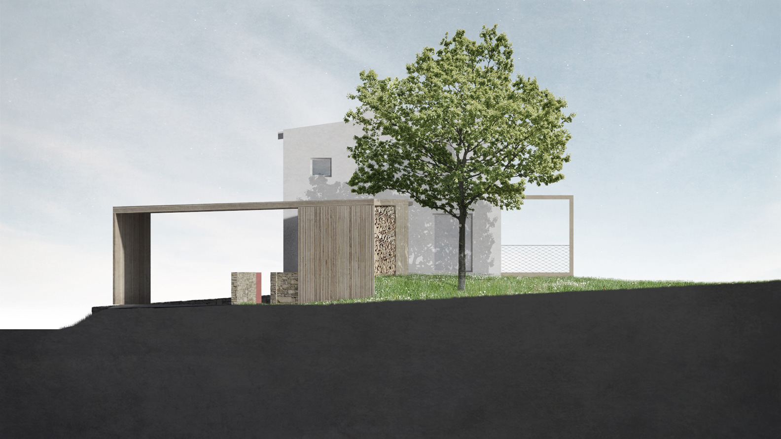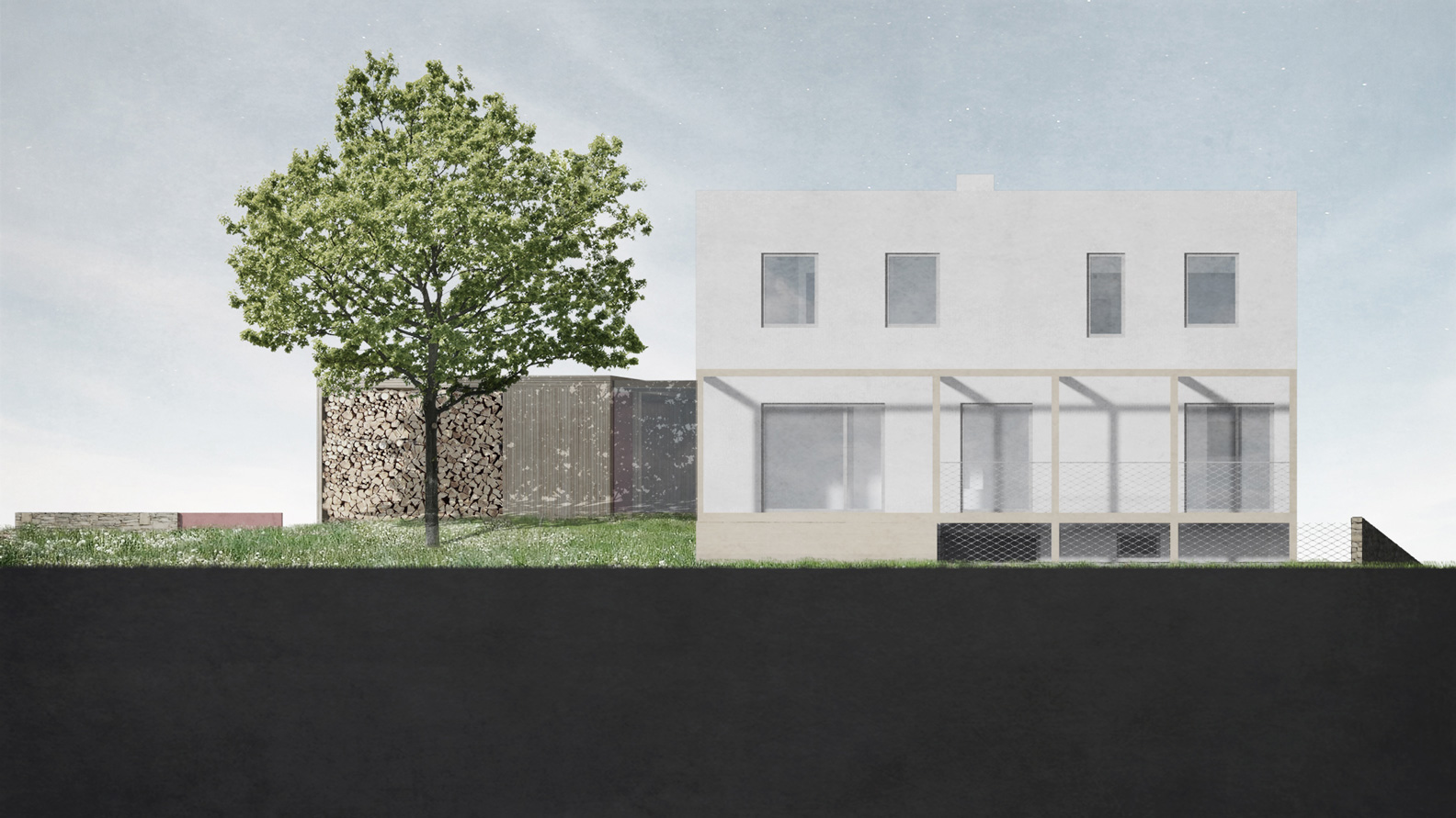 Pozemek obklopen několika domy, volno pouze nahoru do louky. Již se mělo stavět- před několika lety se vylily základy původně navrženého domu. Mladá rodina se rozhodla pro návrh nový, základy pokud možno využít! Uvízly však v podivné poloze- nová cesta která pod pozemkem vznikla, ubrala z terénu a propadla se výrazně pod úroveň základů, a přízemí nad suterénem vychází téměř metr nad zemí. Co s tím? Nakonec se vše obrátilo ve výhodu. Dům pod svahem se tak vzchopil vůči okolním domům. Vznikla obytná pavlač do zahrady- sala terrena. Pod ní sklípek. Dům z venku i zevnitř přejímá motiv svahu.