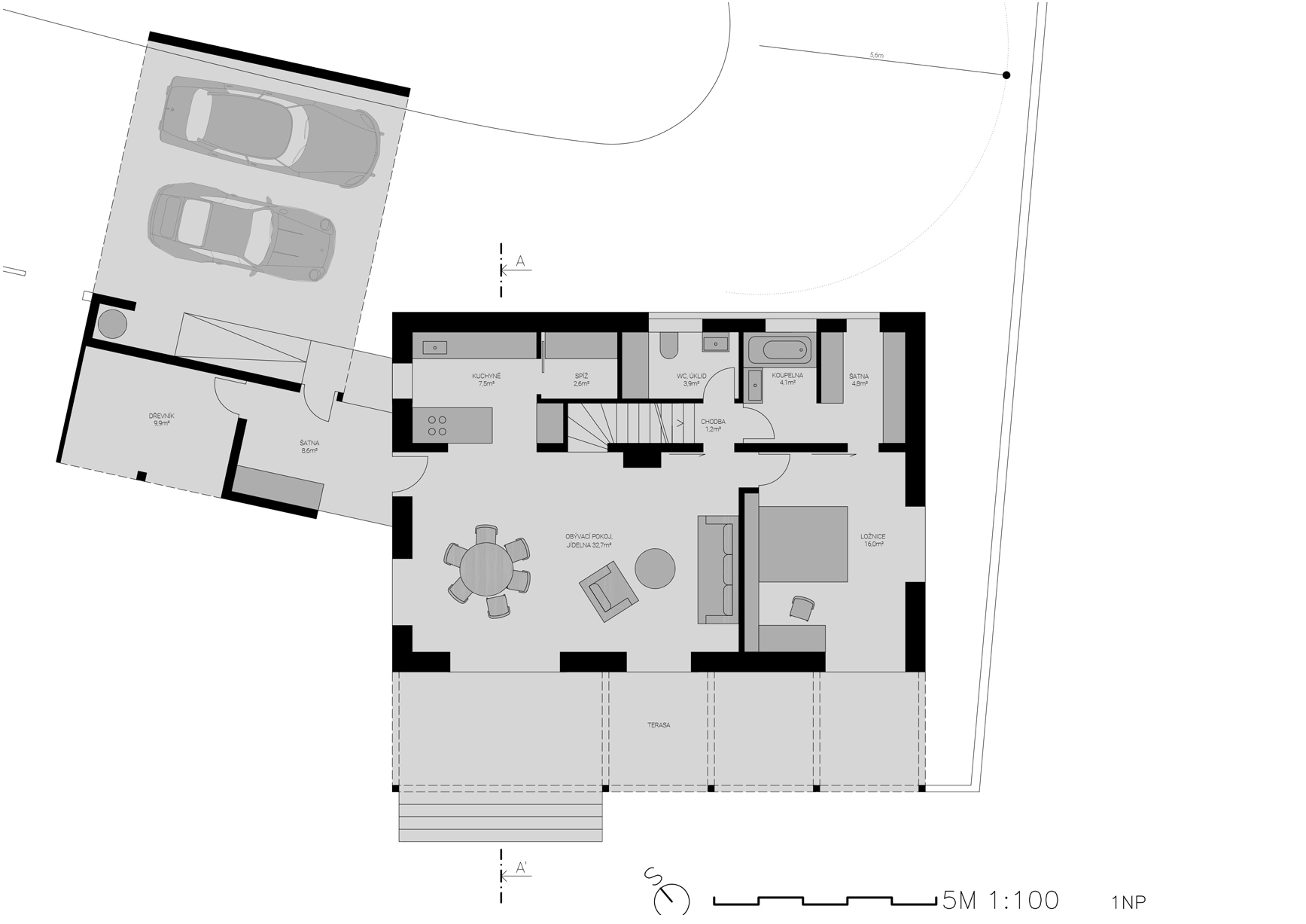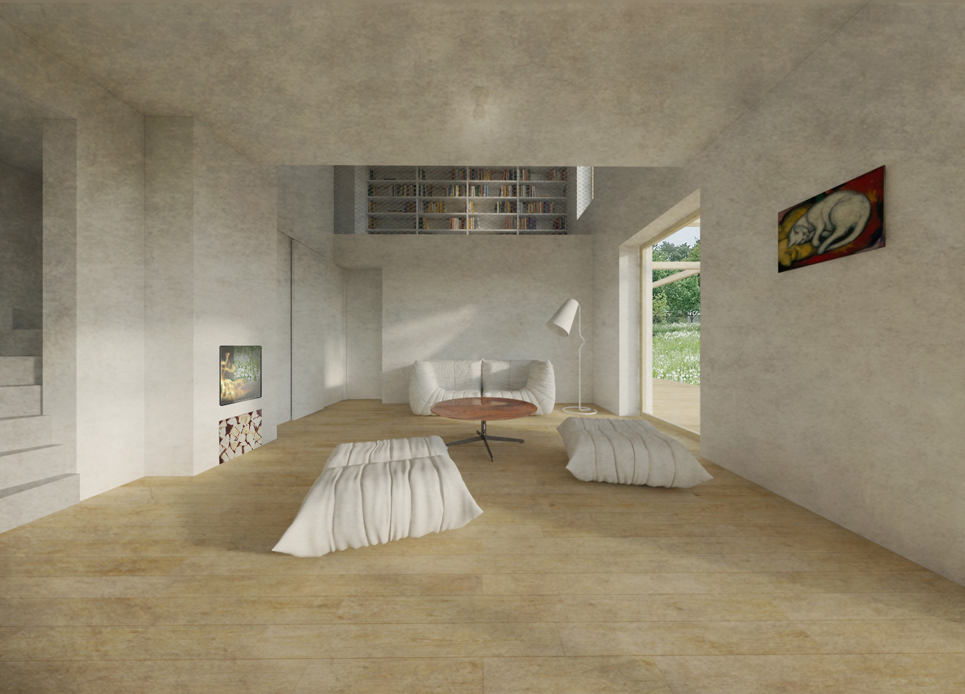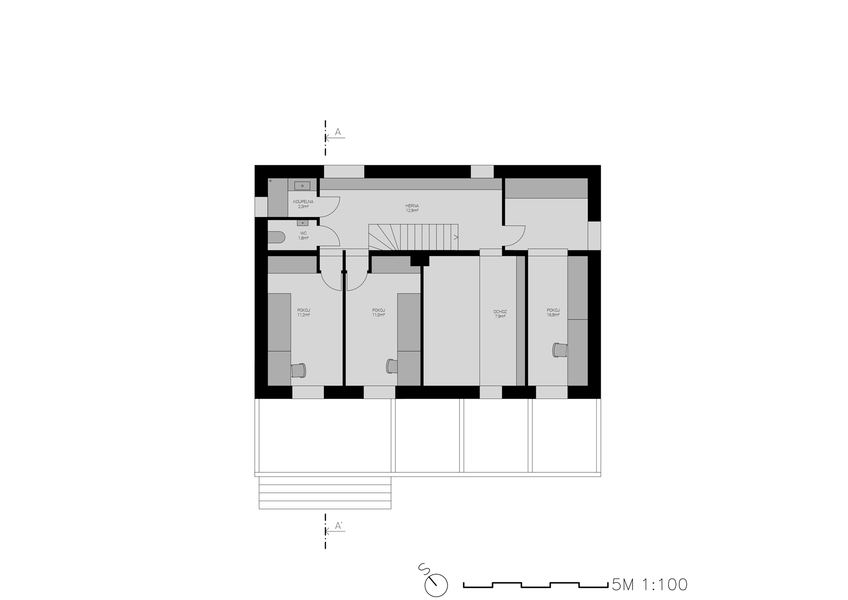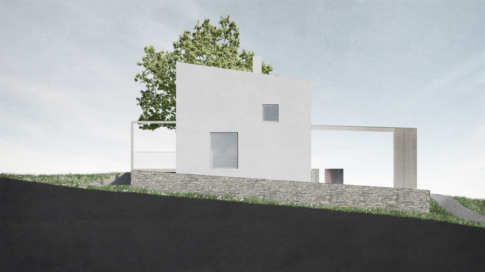Pozemek obklopen několika domy, volno pouze nahoru do louky. Již se mělo stavět- před několika lety se vylily základy původně navrženého domu. Mladá rodina se rozhodla pro návrh nový, základy pokud možno využít! Uvízly však v podivné poloze- nová cesta která pod pozemkem vznikla, ubrala z terénu a propadla se výrazně pod úroveň základů, a přízemí nad suterénem vychází téměř metr nad zemí. Co s tím? Nakonec se vše obrátilo ve výhodu. Dům pod svahem se tak vzchopil vůči okolním domům. Vznikla obytná pavlač do zahrady- sala terrena. Pod ní sklípek. Dům z venku i zevnitř přejímá motiv svahu.