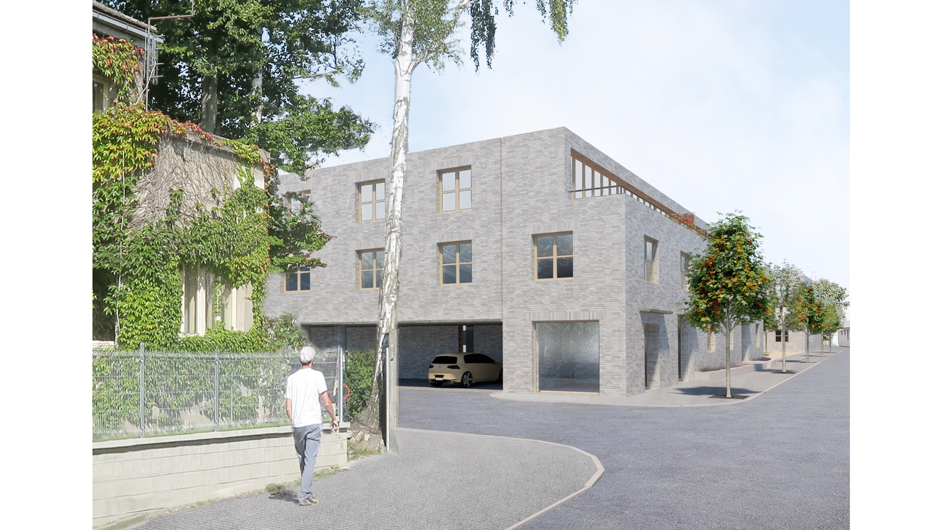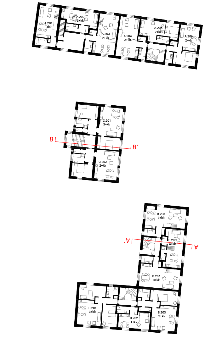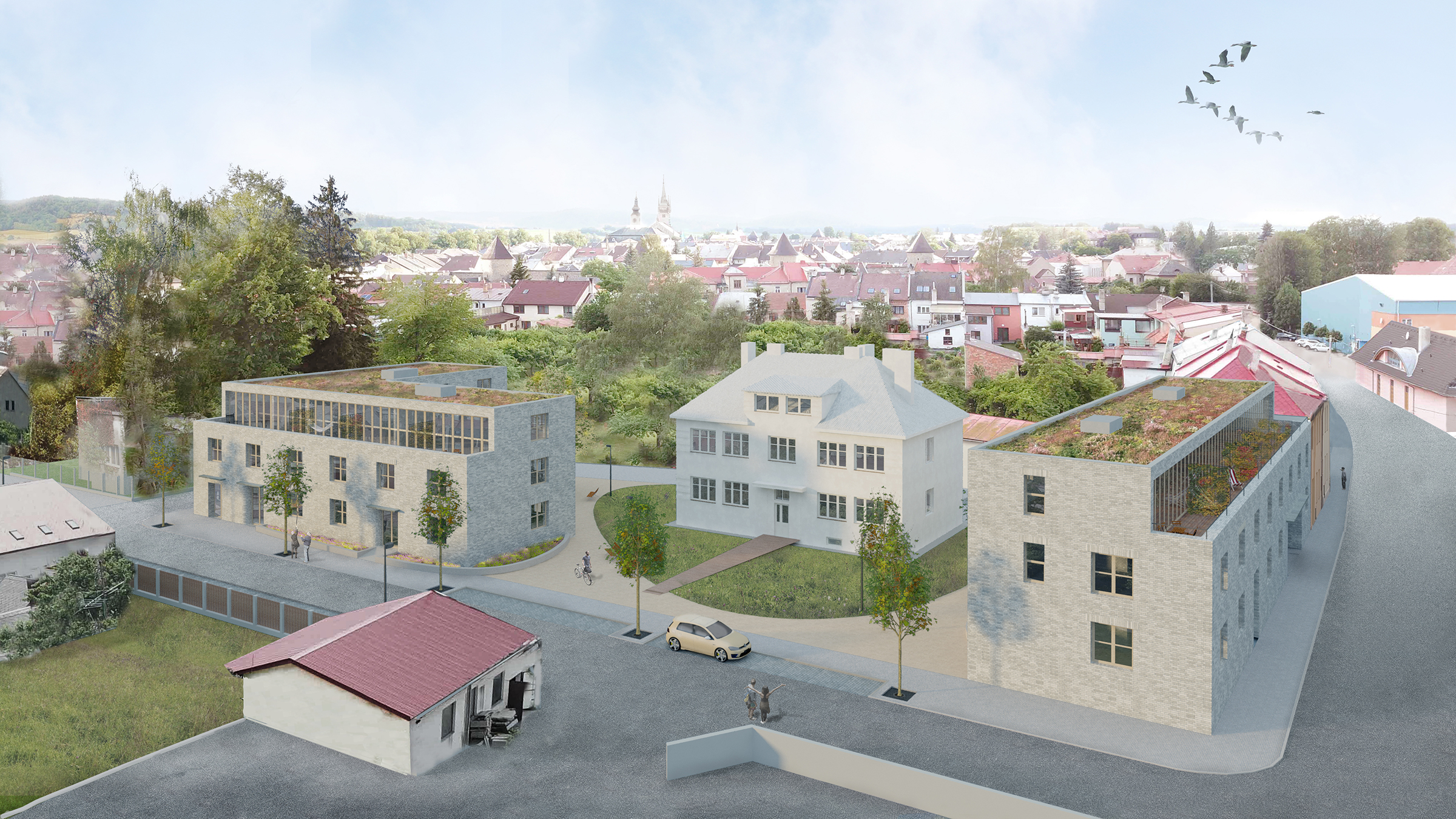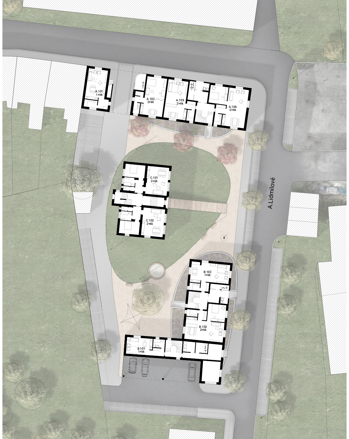 Polička is a city with a „human“ scale, decorated with two distinctive dominants of the town hall and the Church of St. James in a center whitch is surrounded by a crown of walls. A city with pleasant streets, a square and a park. We want to follow up on this in the proposal. We surrounded the original house with two new apartment buildings which are materially connected to the development of both adjacent streets Revoluční and Lidmilové. The new houses follow the scale of the surrounding buildings. The shape of the houses defines the public space. From the side to the street there is more of a relaxing character with benches and a drinking fountain, nearby there is a children‘s section with climbing frames and a sandpit. The facades of the new houses are made of concrete bricks - reminiscent of the stone walls of the walls. The houses are complemented by wooden elements including window and door frames as well as deck decks with trellises. The new houses are surrounded by raised herb gardens separating the windows on the ground floor from direct contact from the street.