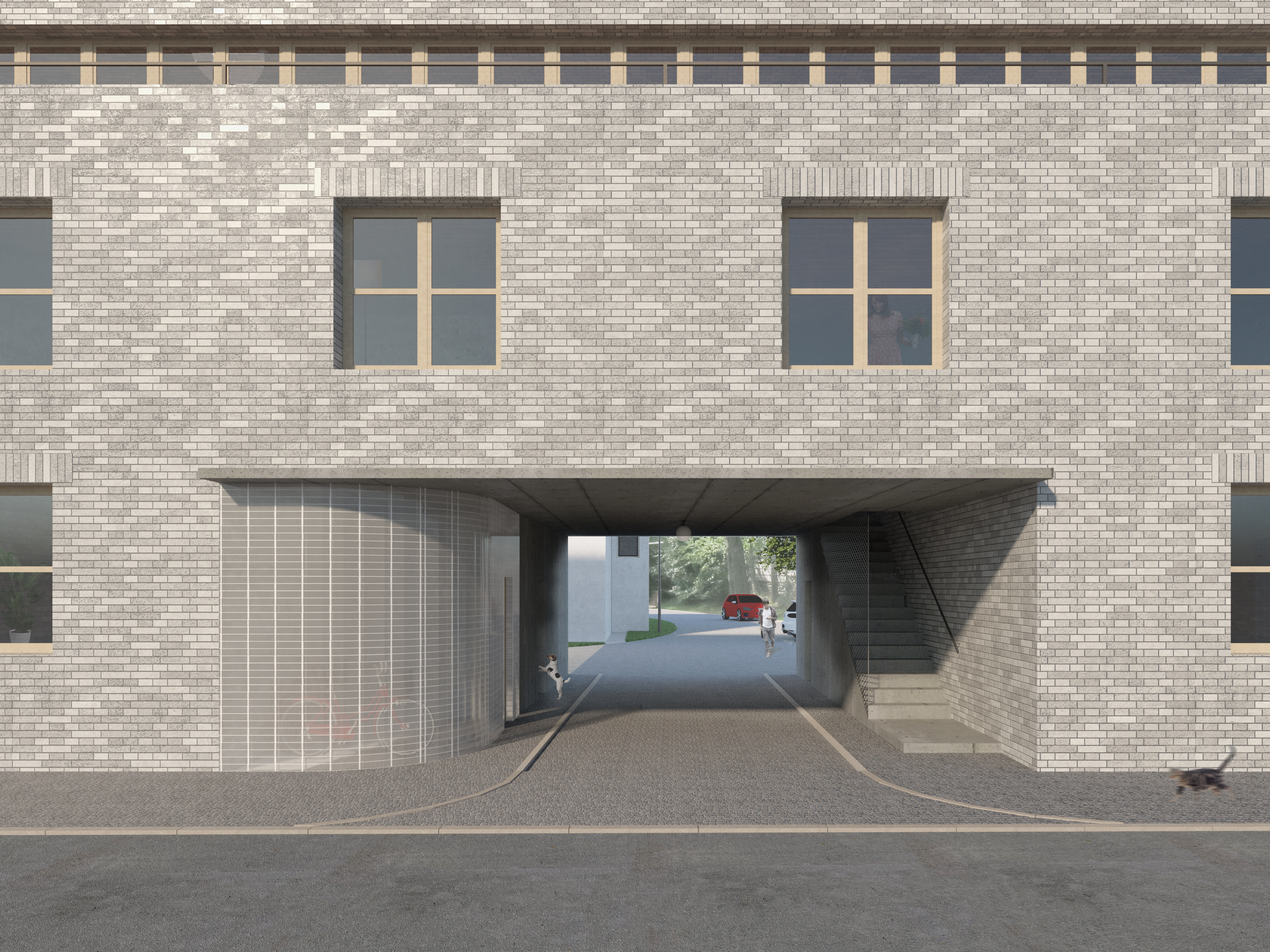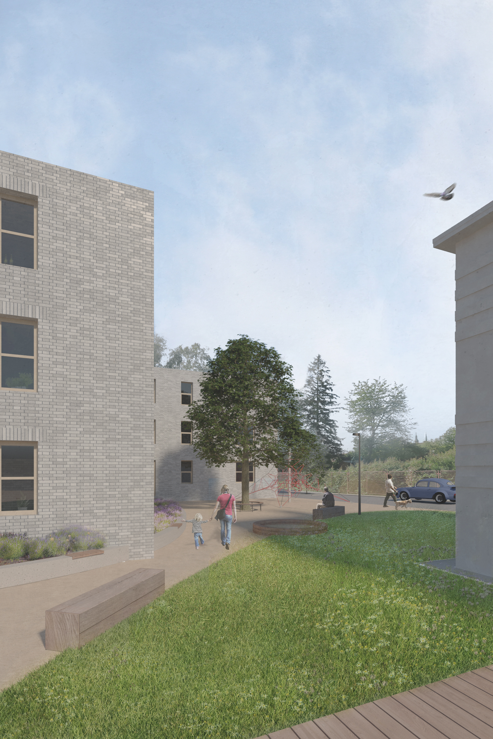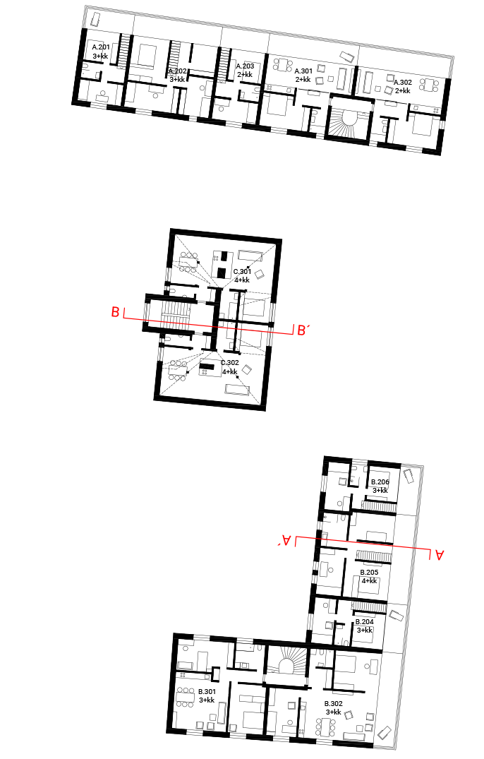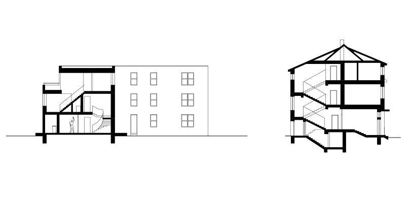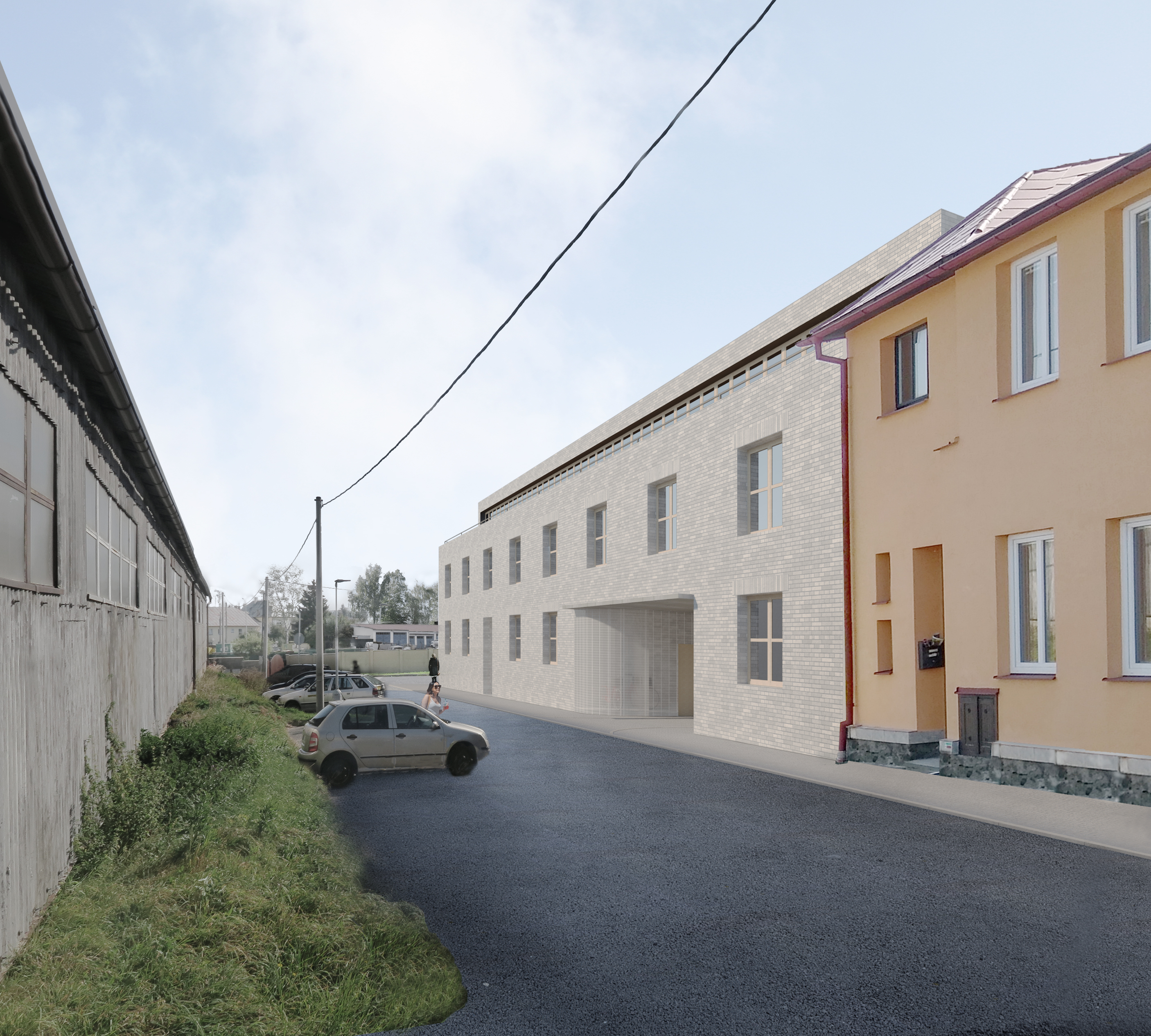 Polička is a city with a „human“ scale, decorated with two distinctive dominants of the town hall and the Church of St. James in a center whitch is surrounded by a crown of walls. A city with pleasant streets, a square and a park. We want to follow up on this in the proposal. We surrounded the original house with two new apartment buildings which are materially connected to the development of both adjacent streets Revoluční and Lidmilové. The new houses follow the scale of the surrounding buildings. The shape of the houses defines the public space. From the side to the street there is more of a relaxing character with benches and a drinking fountain, nearby there is a children‘s section with climbing frames and a sandpit. The facades of the new houses are made of concrete bricks - reminiscent of the stone walls of the walls. The houses are complemented by wooden elements including window and door frames as well as deck decks with trellises. The new houses are surrounded by raised herb gardens separating the windows on the ground floor from direct contact from the street.