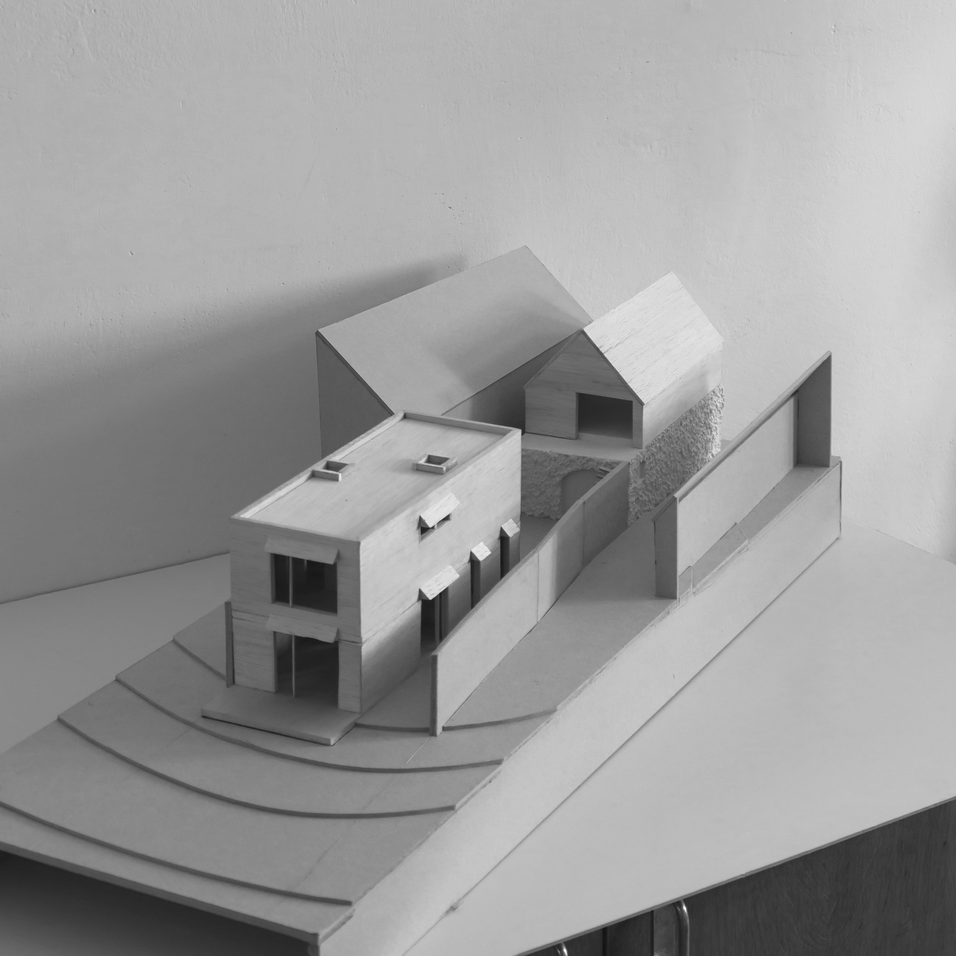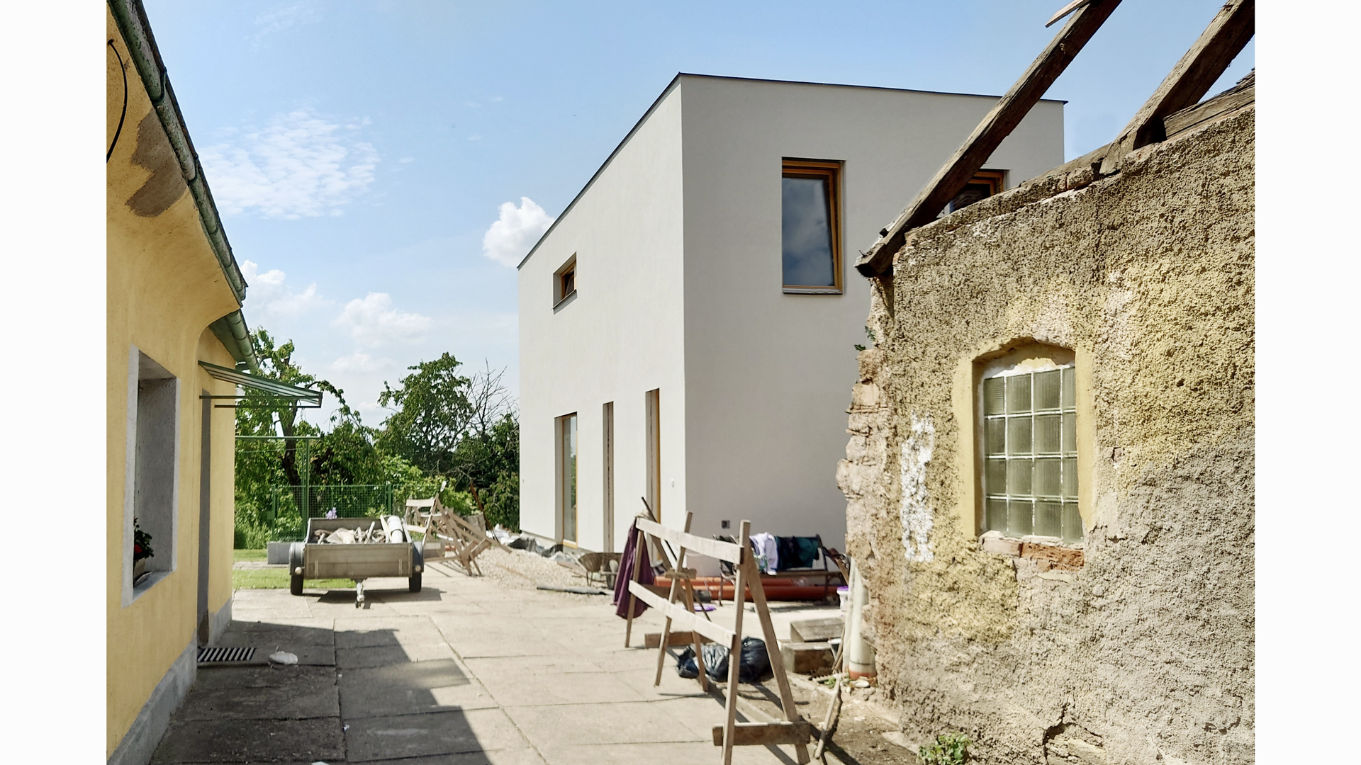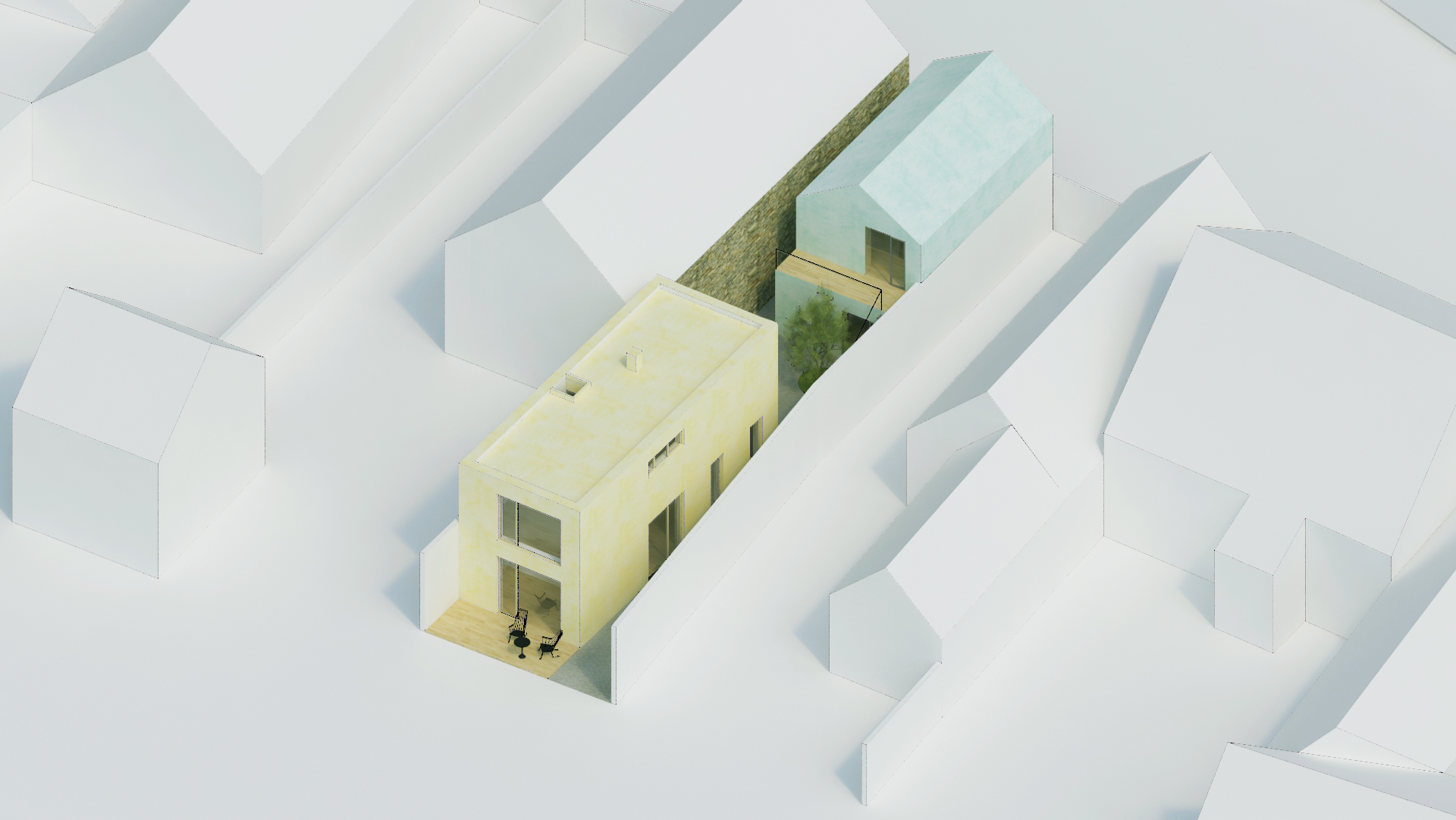 The design of the family house is based on the characteristics of the site itself, the surrounding buildings, and the needs of future users. The house is located on a narrow old plot in a row of houses near St. James Church. The houses face the street with their gables. Halfway through the depth of the plot, the terrain drops steeply into the Elbe valley. The design plans to preserve the oldest part of the existing house for future renovation and transformation, likely into a garage and workshop on the ground floor, and an office with facilities on the upper floor. The actual family house program is located further in the garden behind the retained house and a small courtyard. The narrow plot is illuminated and ventilated by the courtyard, allowing the family house to avoid being squeezed between higher surrounding houses and to open up to the garden with a view, just before the edge of the slope.