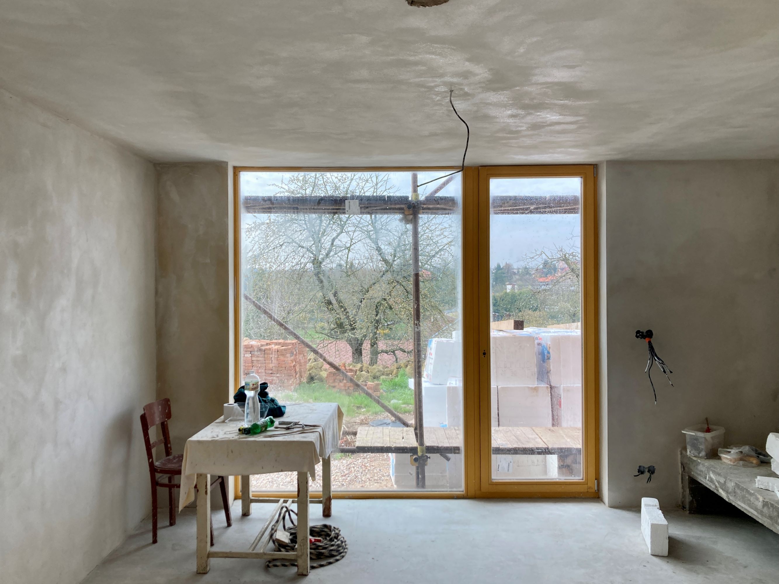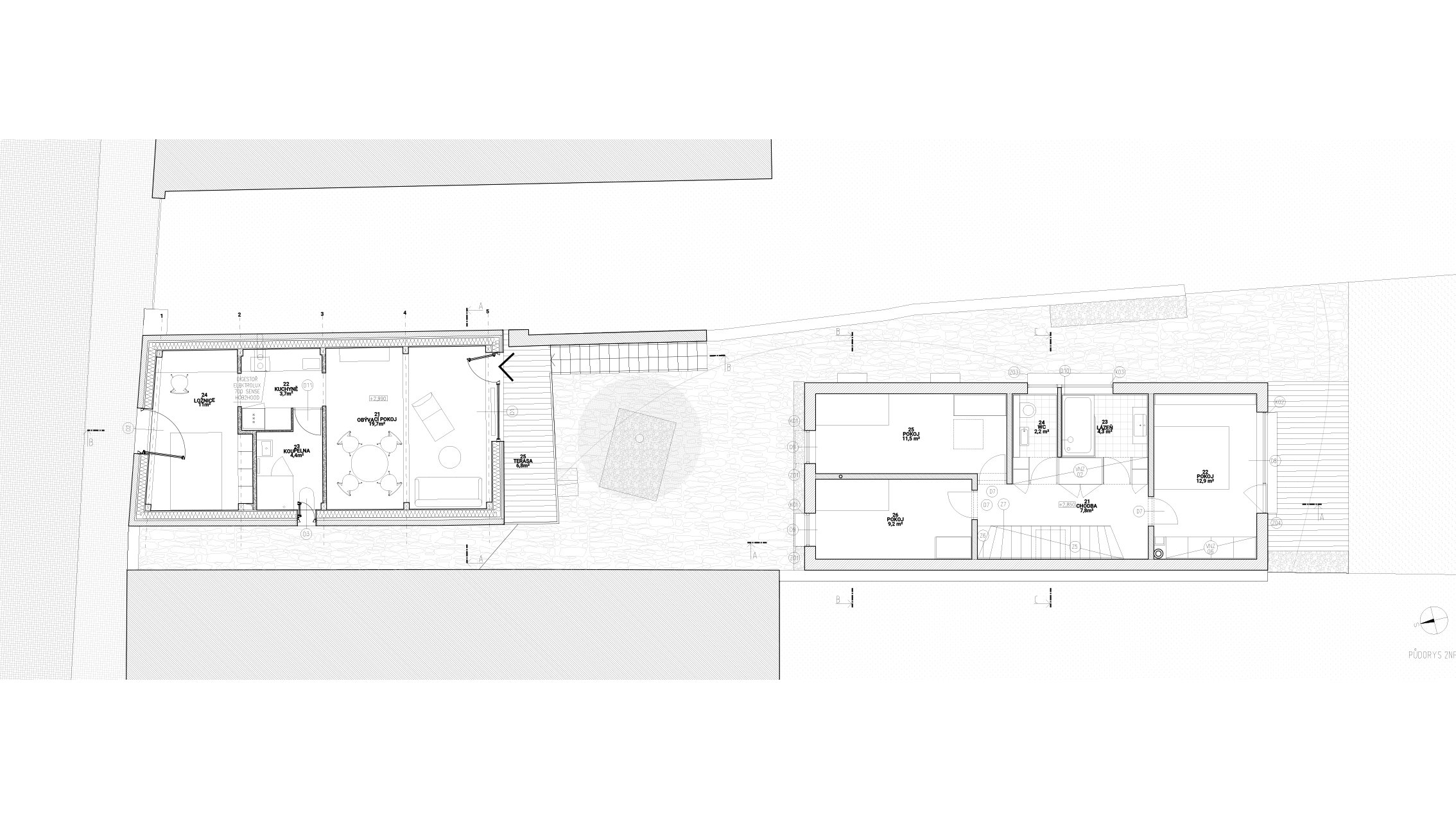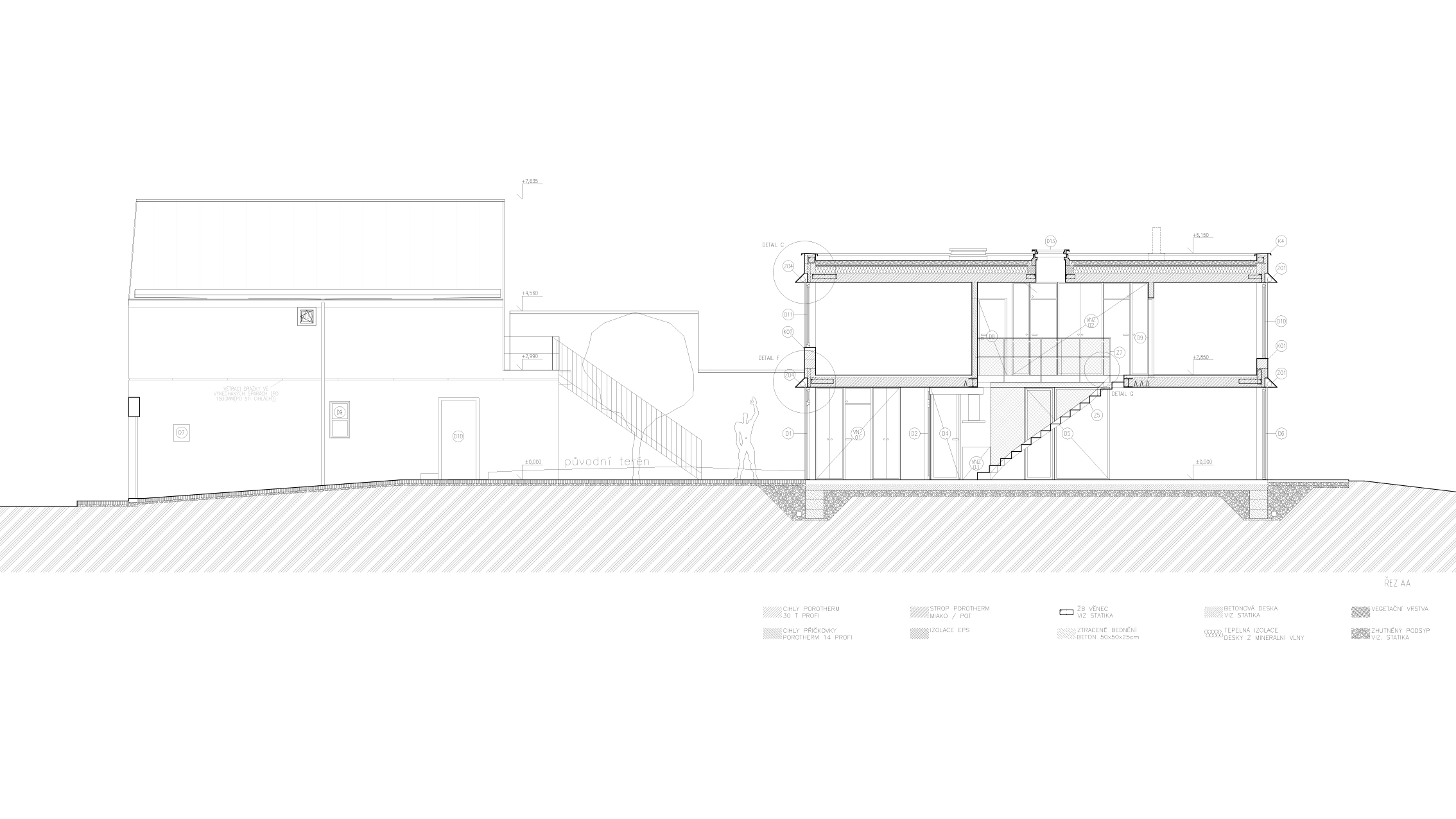 The house has 2 above-ground floors. It is designed with ceramic bricks filled with mineral wool, Porotherm 30 T Profi, 30cm thick. The ceilings are designed to be 25cm thick, made of Miako ceramic inserts filled with concrete. On the ground floor, windows extend from floor to ceiling, without sills and lintels, reaching up to the ring beam without any additional supports. Upstairs, the windows also reach the ceiling but have sills. Partitions are made of ceramic Porotherm 11.5 Profi and Porotherm 8 Profi. Floors throughout the house, including bathrooms, are designed with oak parquet laid in a "belt" pattern. The roof is insulated with mineral wool, sloped towards the neighbor where the gutter is located. The remaining three edges of the roof have a parapet. The roof is designed as an extensive green roof to protect the waterproofing layer, accumulate water, and prevent the house from overheating. The house is heated by underfloor heating combined with convectors under the windows. The heat source for heating and hot water will be a gas condensing boiler. A wood-burning fireplace is designed as a supplementary heat source.