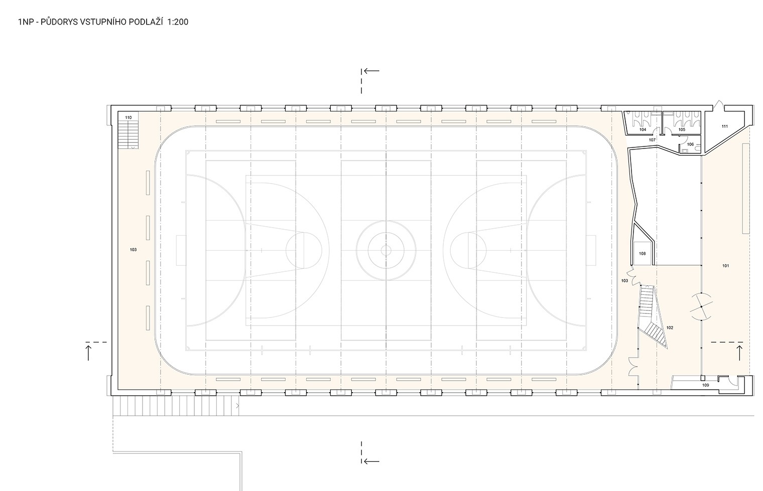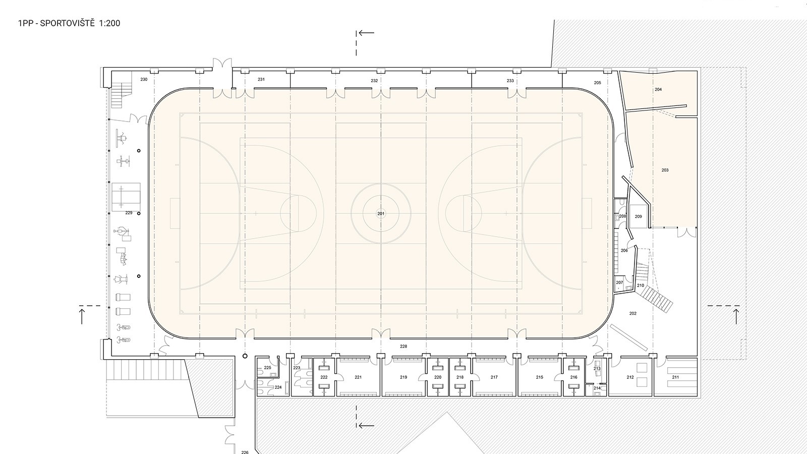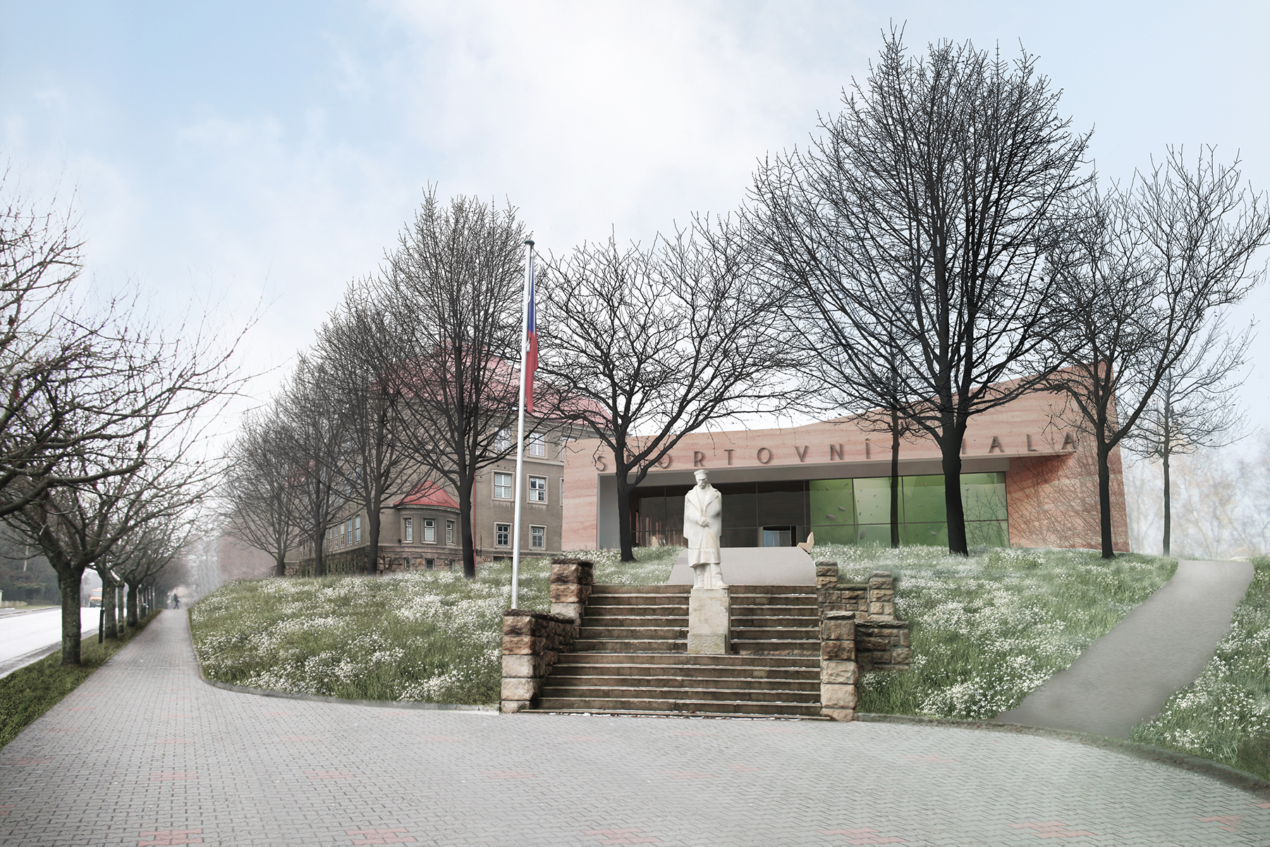 Stavba nové sportovní haly je příležitostí pro obohacení města o významnou instituci, která slouží nejen školám, ale i široké veřejnosti. Tento význam se snažíme co nejlépe vyjádřit naším návrhem, a to ve dvou rovinách: umístěním domu i jeho architektonickým výrazem. Sportovní hala je z podstaty objemnou stavbou. Nepřipouštíme ale, aby zabrala prostor za gymnáziem a schovala se za něj. Proto ji natáčíme a posouváme směrem k centru, kde příchozím hledí v ústrety sám prezident osvoboditel. Otevřený vstupní portál pod rozsáhlým přístřeším nabízí přímý pohled na lezeckou stěnu, která zdánlivé zvedá pravý roh střechy budovy. Využíváme různých úrovní terénu a halu částečně zapouštíme do země. Spodní úroveň, odpovídající herní ploše a jejímu zázemí se šatnami, je navržena do úrovně terénu za školou. Horní úroveň, se vstupem, vestibulem a ochozem pro diváky bude v úrovni návrší mezi sochou a gymnáziem. Hala tak bude mít čistě odděleny provozy sportovců a diváků. Zapuštěním haly do terénu zůstává nadzemní objem budovy menší a neatakuje okolí. Samotná architektura stavby je inspirována geologickými poměry Novopacka. Dům má zemitý vrstvený výraz, fasáda je tvořena dusaným betonem s pigmenty převzatými z okolí Nové Paky. Připomíná tak okolní načervenalé svahy, či nález kmene před městským muzeem. Zasazení novostavby do přírody podporuje i osazení ploché střechy suchomilnou vegetací a výsadba popínavých bylin podél fasád. Zemitý, těžký a solidní výraz nové architektury je v tomto kontextu nezbytný: lehká konstrukce by v blízkosti klasické, vysoké a objemné školy (a koneckonců i v tomto podhorském kraji) vypadala nepatřičně.
