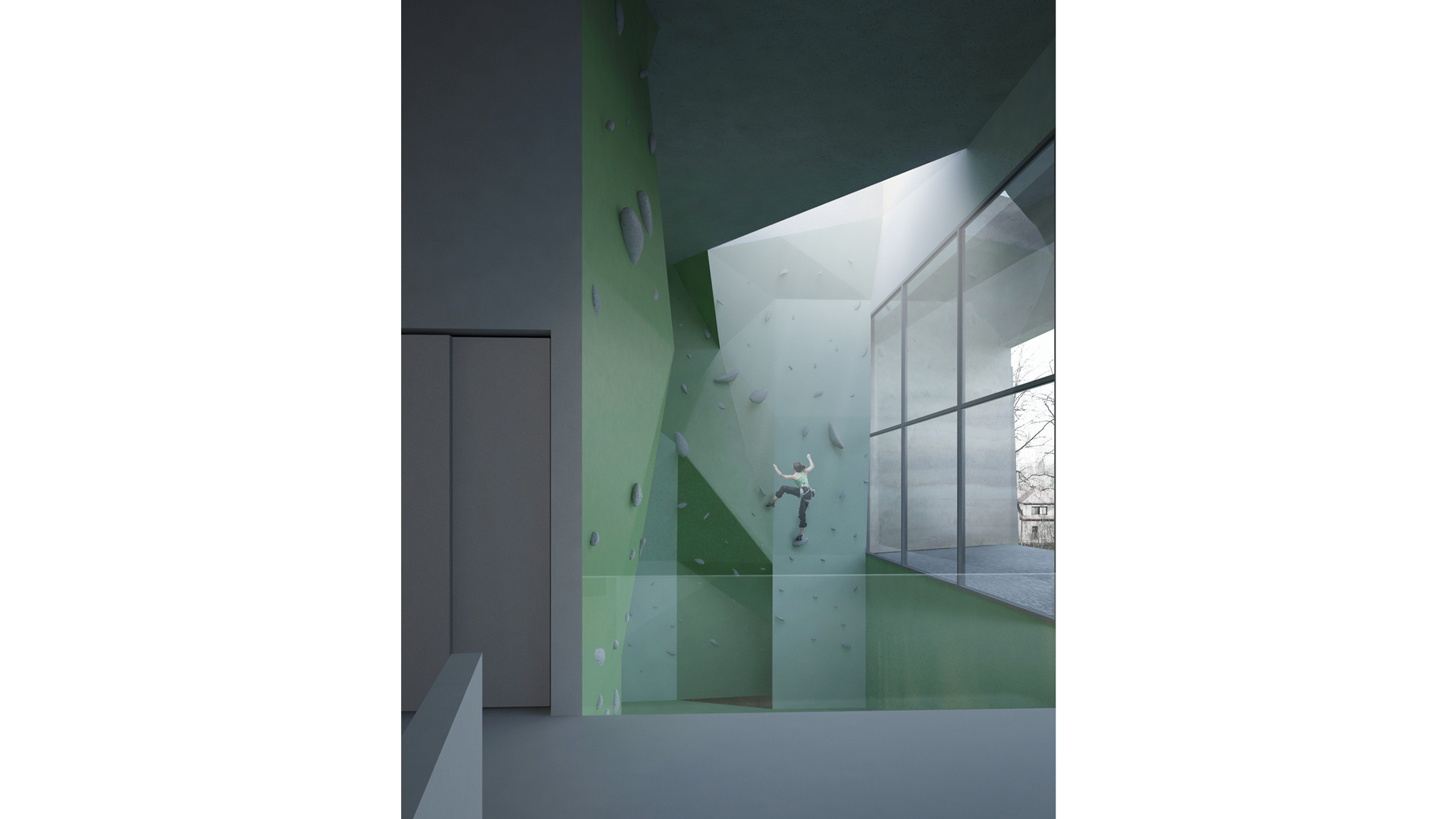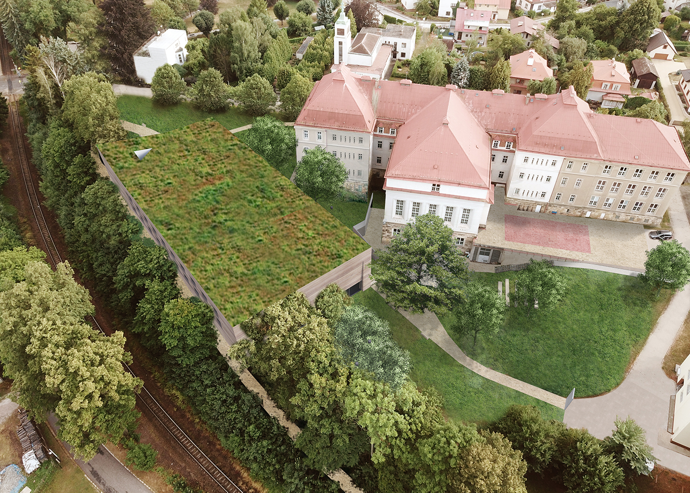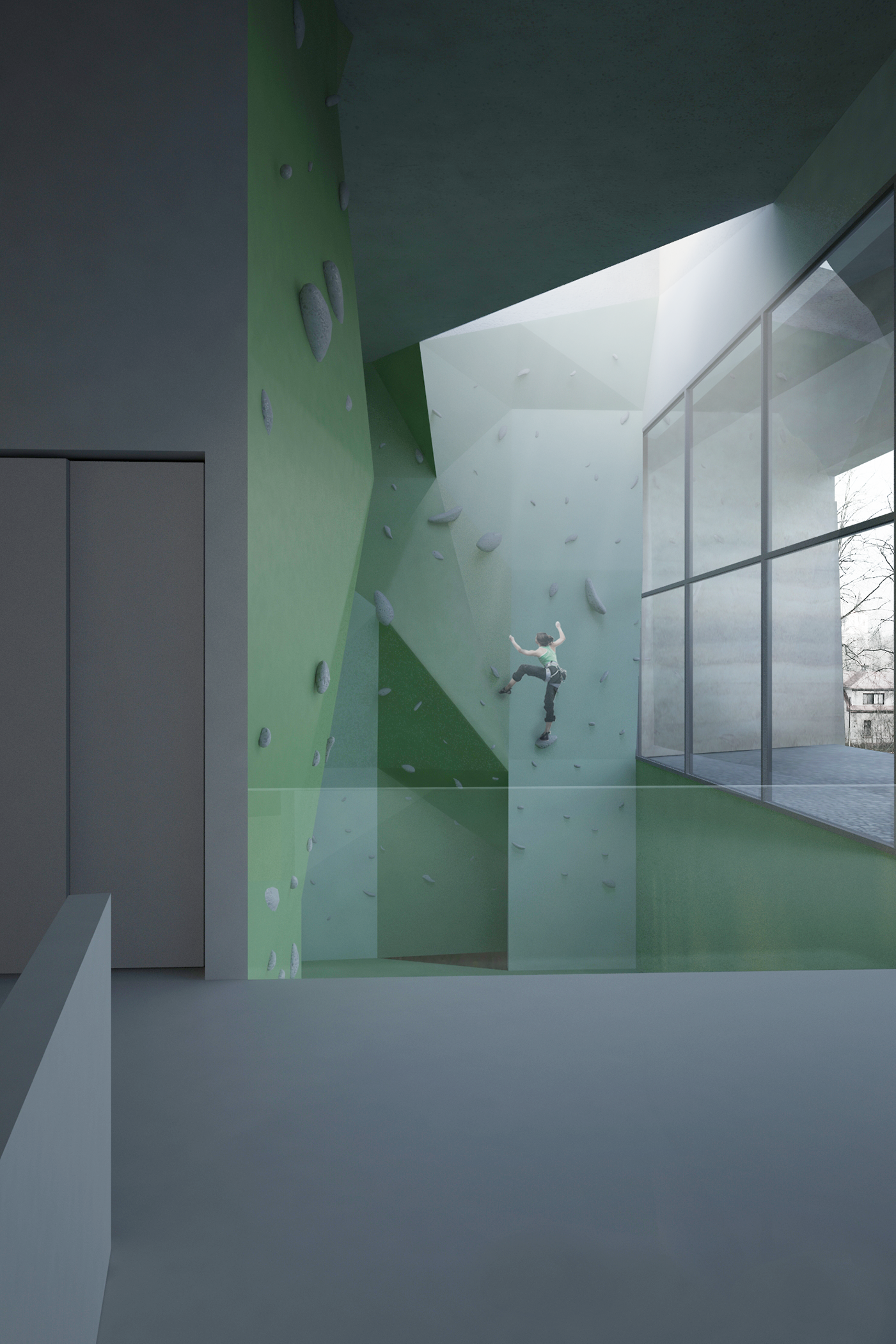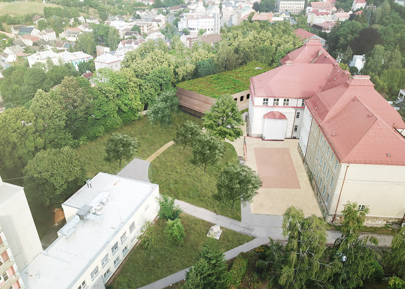 Stavba nové sportovní haly je příležitostí pro obohacení města o významnou instituci, která slouží nejen školám, ale i široké veřejnosti. Tento význam se snažíme co nejlépe vyjádřit naším návrhem, a to ve dvou rovinách: umístěním domu i jeho architektonickým výrazem. Sportovní hala je z podstaty objemnou stavbou. Nepřipouštíme ale, aby zabrala prostor za gymnáziem a schovala se za něj. Proto ji natáčíme a posouváme směrem k centru, kde příchozím hledí v ústrety sám prezident osvoboditel. Otevřený vstupní portál pod rozsáhlým přístřeším nabízí přímý pohled na lezeckou stěnu, která zdánlivé zvedá pravý roh střechy budovy. Využíváme různých úrovní terénu a halu částečně zapouštíme do země. Spodní úroveň, odpovídající herní ploše a jejímu zázemí se šatnami, je navržena do úrovně terénu za školou. Horní úroveň, se vstupem, vestibulem a ochozem pro diváky bude v úrovni návrší mezi sochou a gymnáziem. Hala tak bude mít čistě odděleny provozy sportovců a diváků. Zapuštěním haly do terénu zůstává nadzemní objem budovy menší a neatakuje okolí. Samotná architektura stavby je inspirována geologickými poměry Novopacka. Dům má zemitý vrstvený výraz, fasáda je tvořena dusaným betonem s pigmenty převzatými z okolí Nové Paky. Připomíná tak okolní načervenalé svahy, či nález kmene před městským muzeem. Zasazení novostavby do přírody podporuje i osazení ploché střechy suchomilnou vegetací a výsadba popínavých bylin podél fasád. Zemitý, těžký a solidní výraz nové architektury je v tomto kontextu nezbytný: lehká konstrukce by v blízkosti klasické, vysoké a objemné školy (a koneckonců i v tomto podhorském kraji) vypadala nepatřičně.