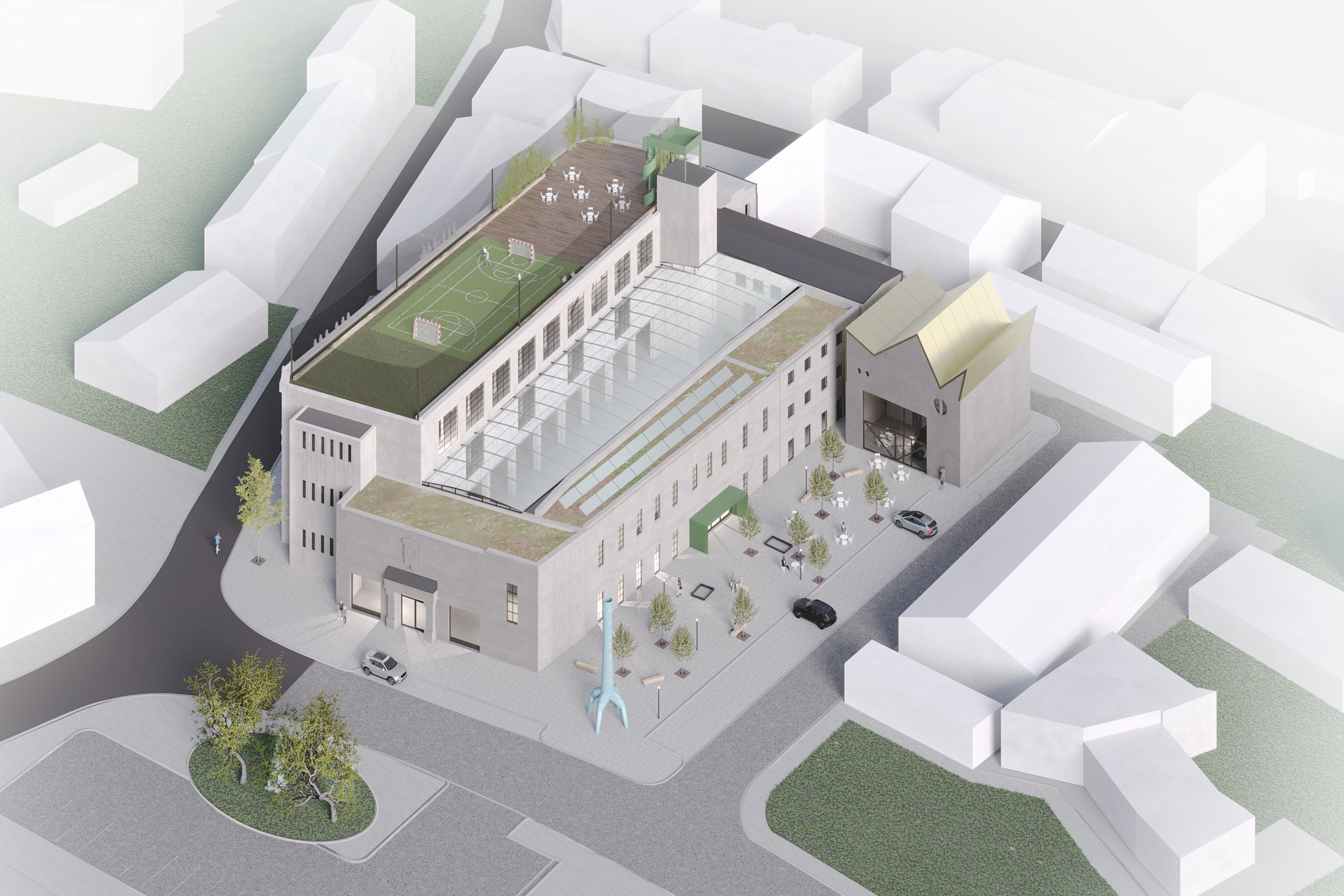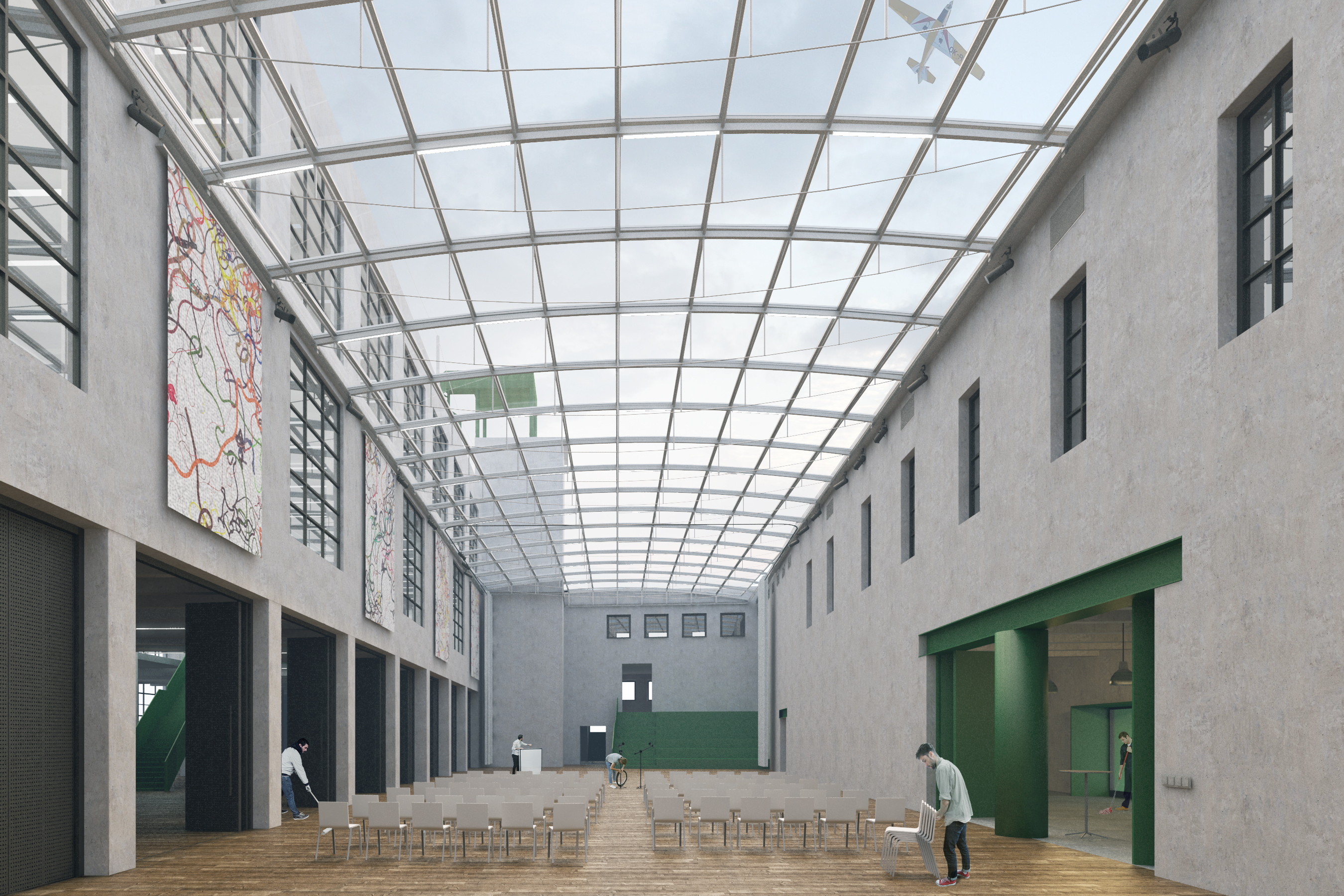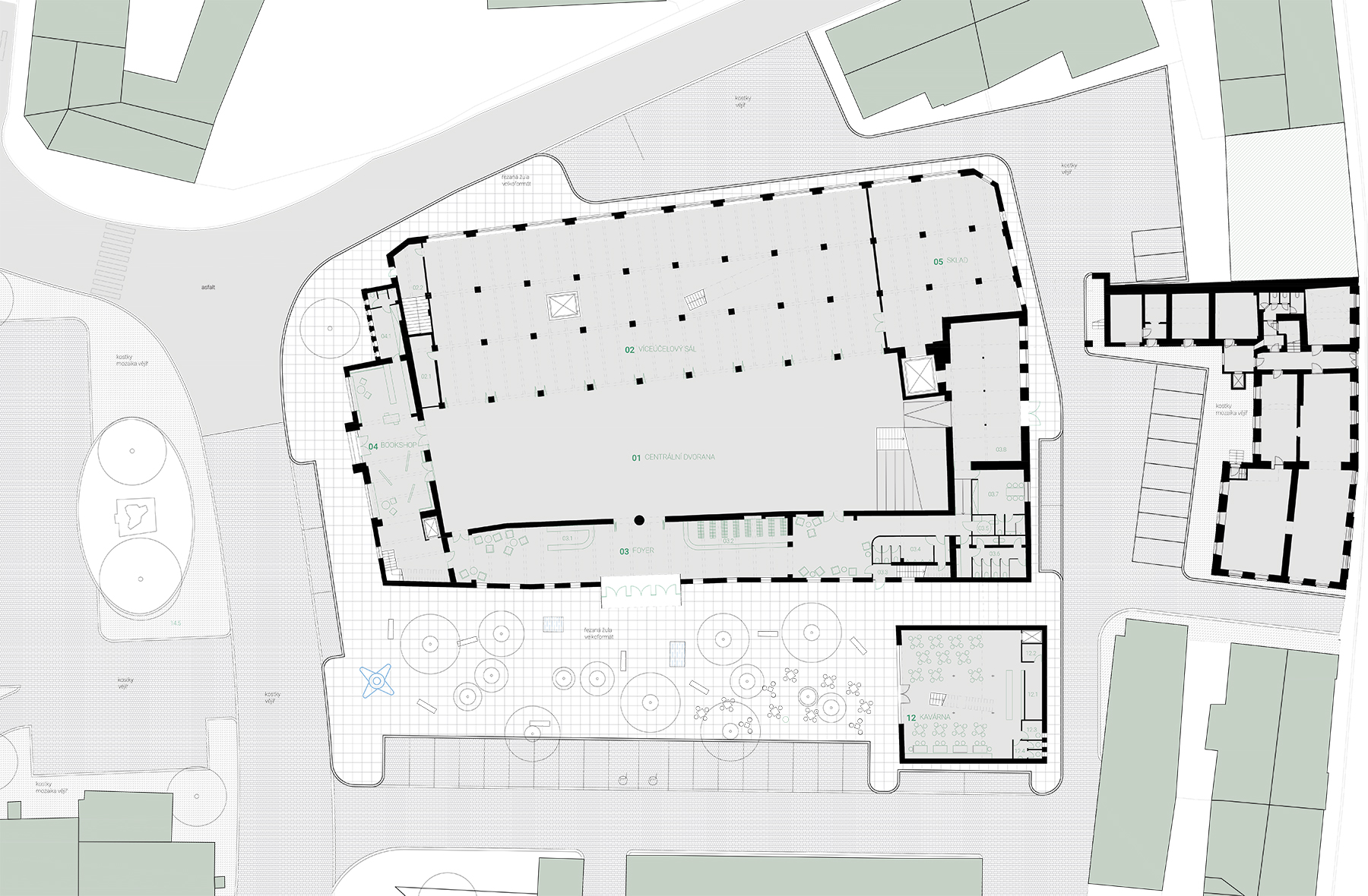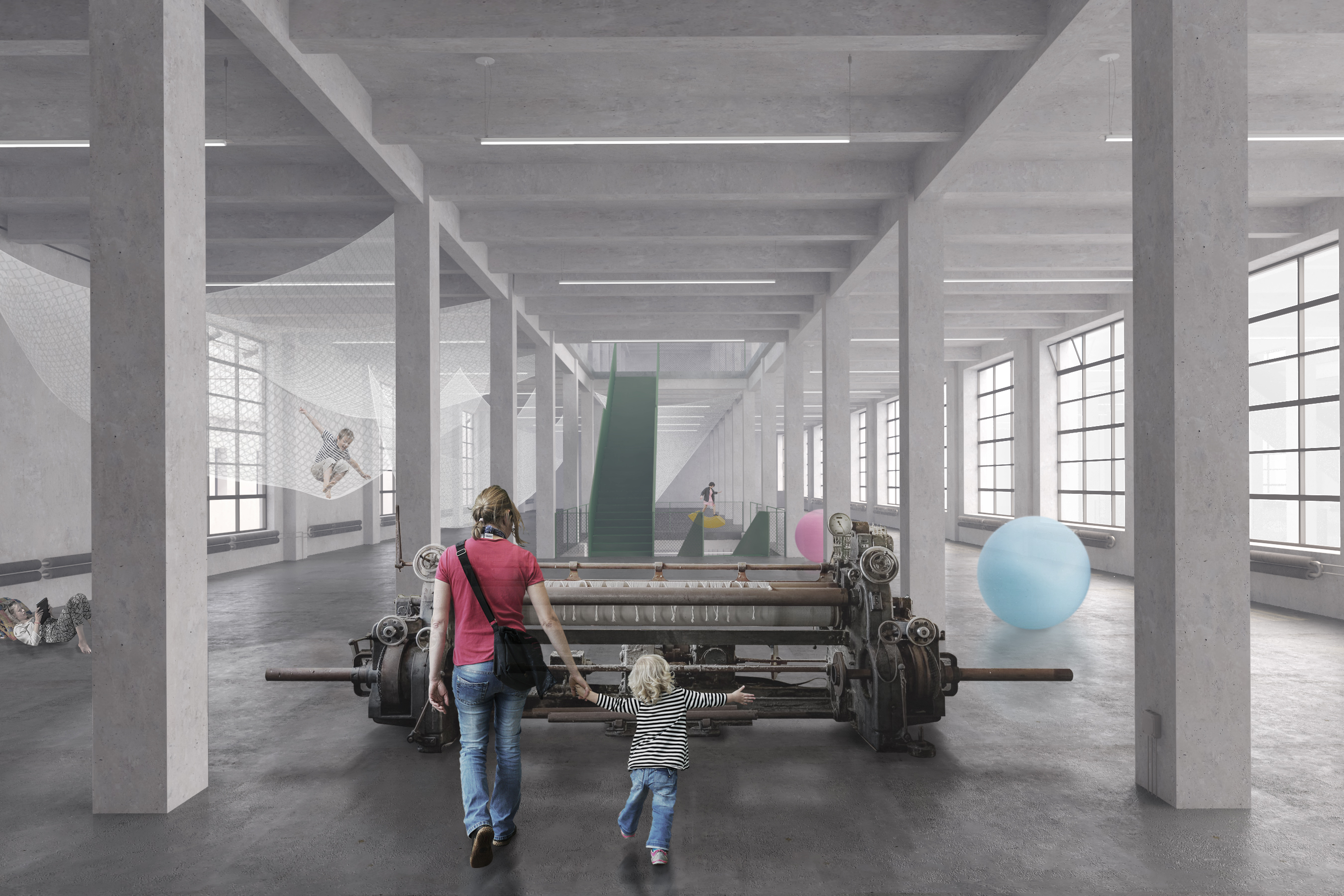 Navrhujeme přiblížit areál stavu z poloviny 20. století, patrného z dobových fotografií, zbouráním nehodnotných administrativních staveb Strojtexu. Neobnovujeme stav však doslovně, vzniká zde nová funkce s novým významem pro město. Špalíček budov s centrálním prostorem a jedním výrazným domem stranou. Toto potvrzujeme zbouráním světlíku, na jehož místě vzniká dvorana s prosklenou střechou, orientační střed, ze kterého se rozbíhají různé expozice. Zároveň však slouží jako sál s jedinečnými industriálními kulisami pro pestré kulturní využití. Ten neposedný dům stranou je loutkovým divadlem, s kavárnou ve foyer. Bez okolků projevuje svůj charakter. Před ním je prostranství se stromy, doplněné lavičkami a kašnami. Mimochodem, továrna bez komína nemůže být – ve předu u silnice je vztyčena socha – poutačkomín! Z nejvyšší stavby – z třípodlažní haly je jedinečný výhled na město a okolní krajinu, jejíž patronkou je nedaleká Zvičina. Nechtěli jsme nechat střechu zapovězenou, proto jsme ji zpřístupnili. Navrhujeme zde terasu pro pořádání večírků, dětské hřiště a trávník na piknik. Prostor střechy vymezuje síť, vytvářející komornější, bezpečnější atmosféru, zároveň budovu třípodlažní haly síť nastavuje a podtrhuje její výjimečnost. Továrna, špalíček budov, se stává svébytným místem se společenským významem nejen pro obyvatele Dvora, ale i pro turisty. Areál továrny je vymezen vlastní dlažbou, stává se ostrovem kultury, odpočinku i zábavy. Zásadní je její otevřenost, aby tepala životem po celý den. Proto počítáme se třemi, respektive čtyřmi vstupy: z náměstí Republiky, z piazzetty před loutkovým divadlem, a z průjezdu z Tylovi ulice a s bezbariérovým přímým napojením na městskou knihovnu. Parter továrny se tak stává volně přístupnou součástí veřejného prostoru města. Zastřešení dvorany je neseno subtilní vzpinadlovou konstrukcí, která generuje pouze svislé síly do stěn a nenamáha je ohybem. Navržená konstrukce je staticky výhodná a materiálově úsporná.