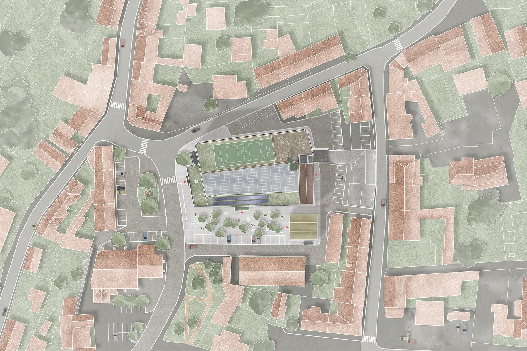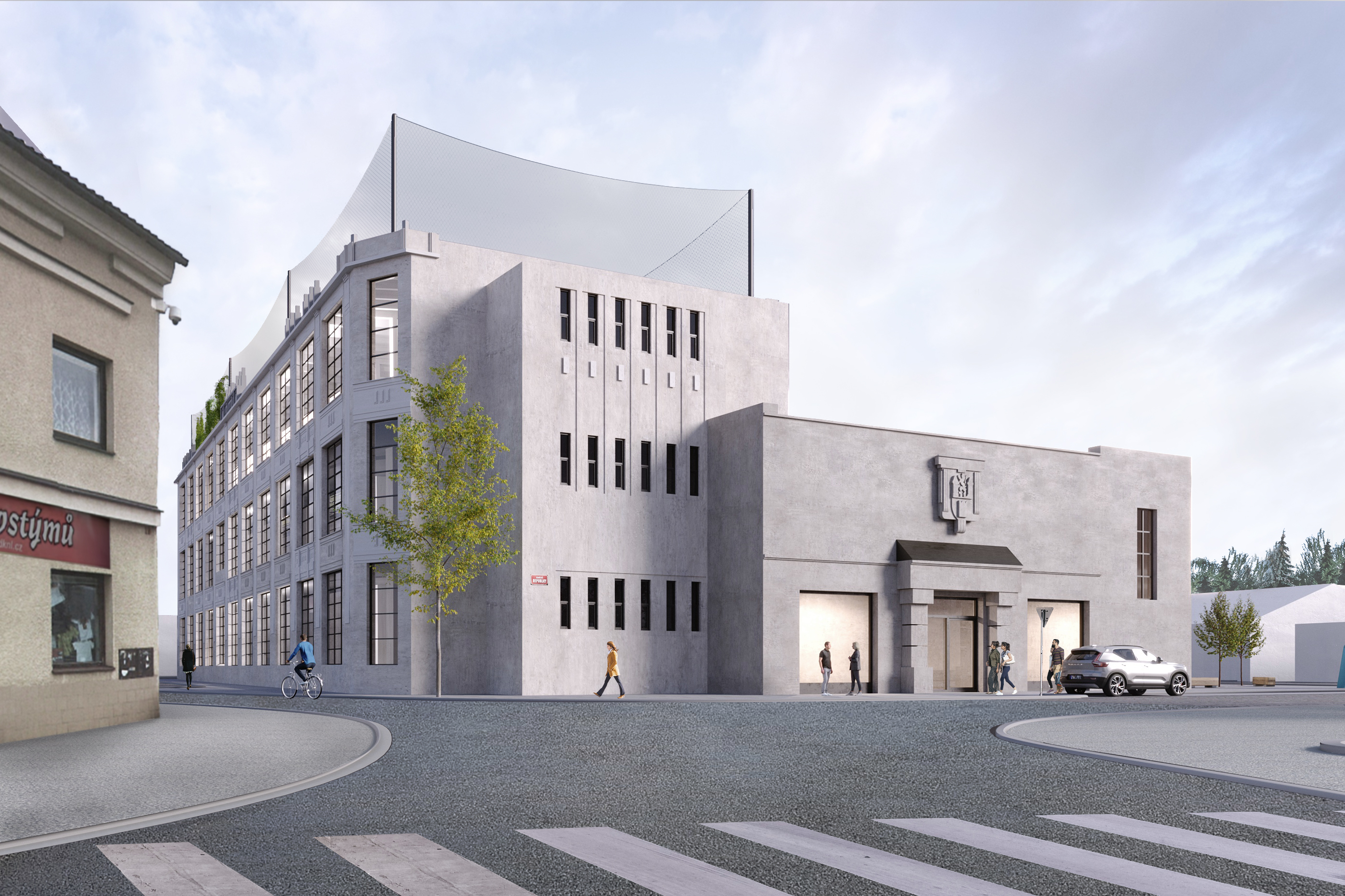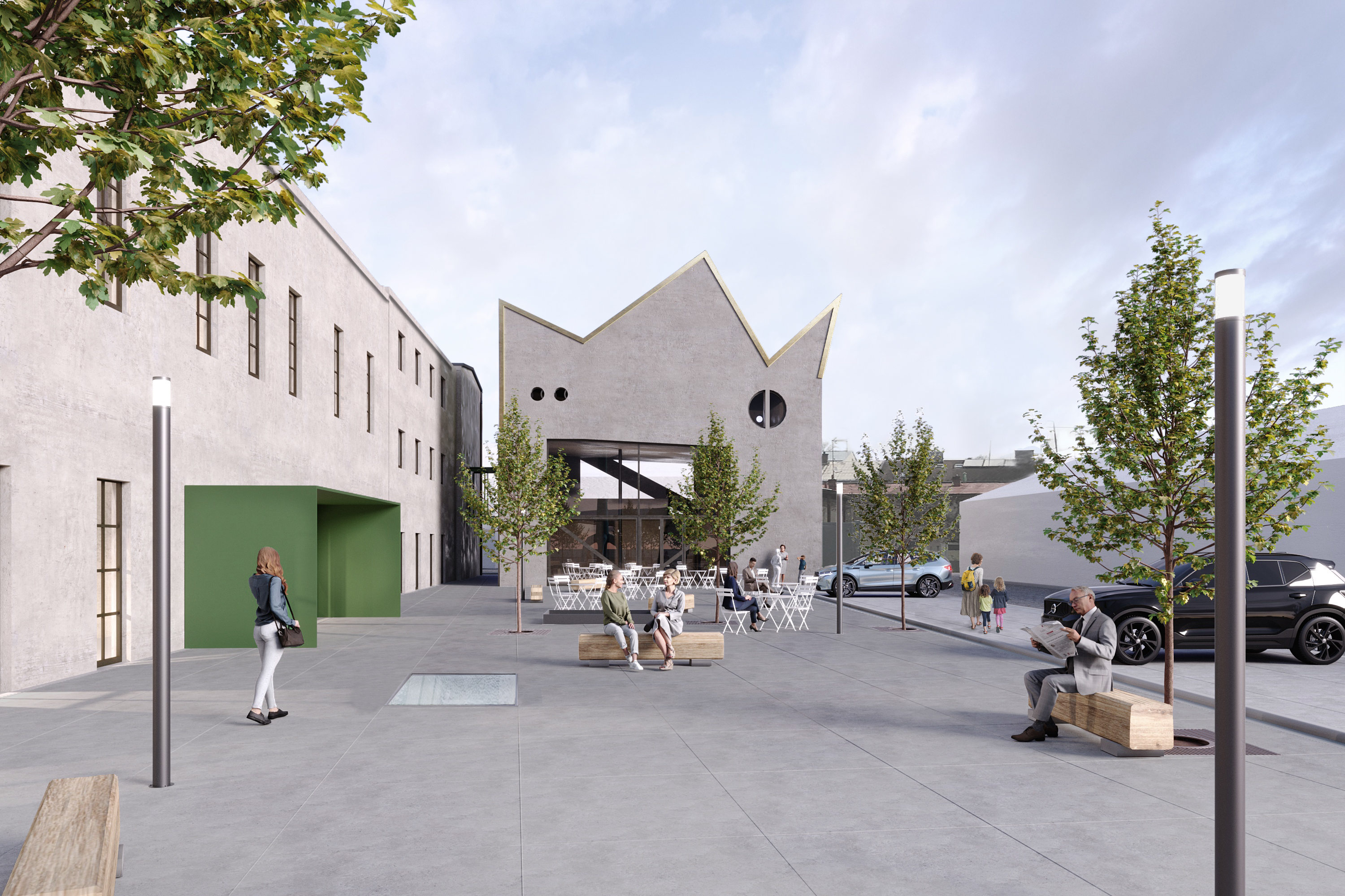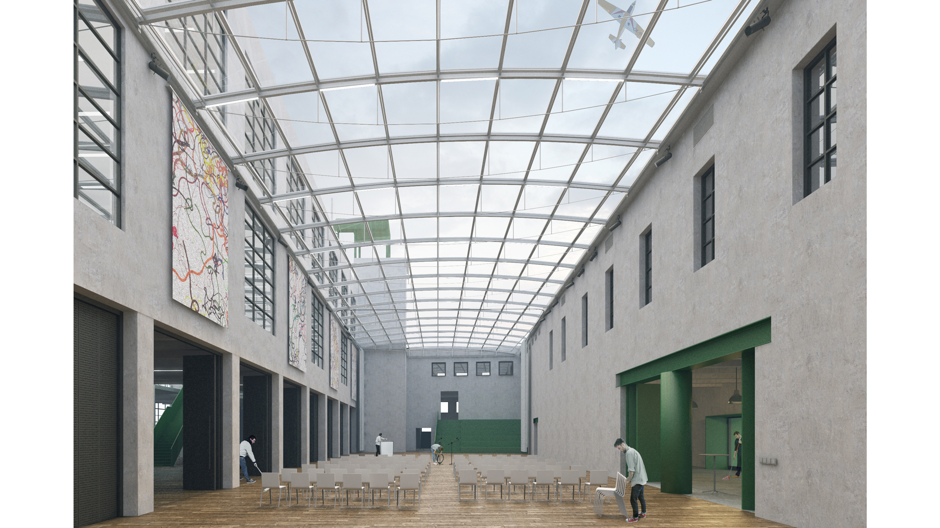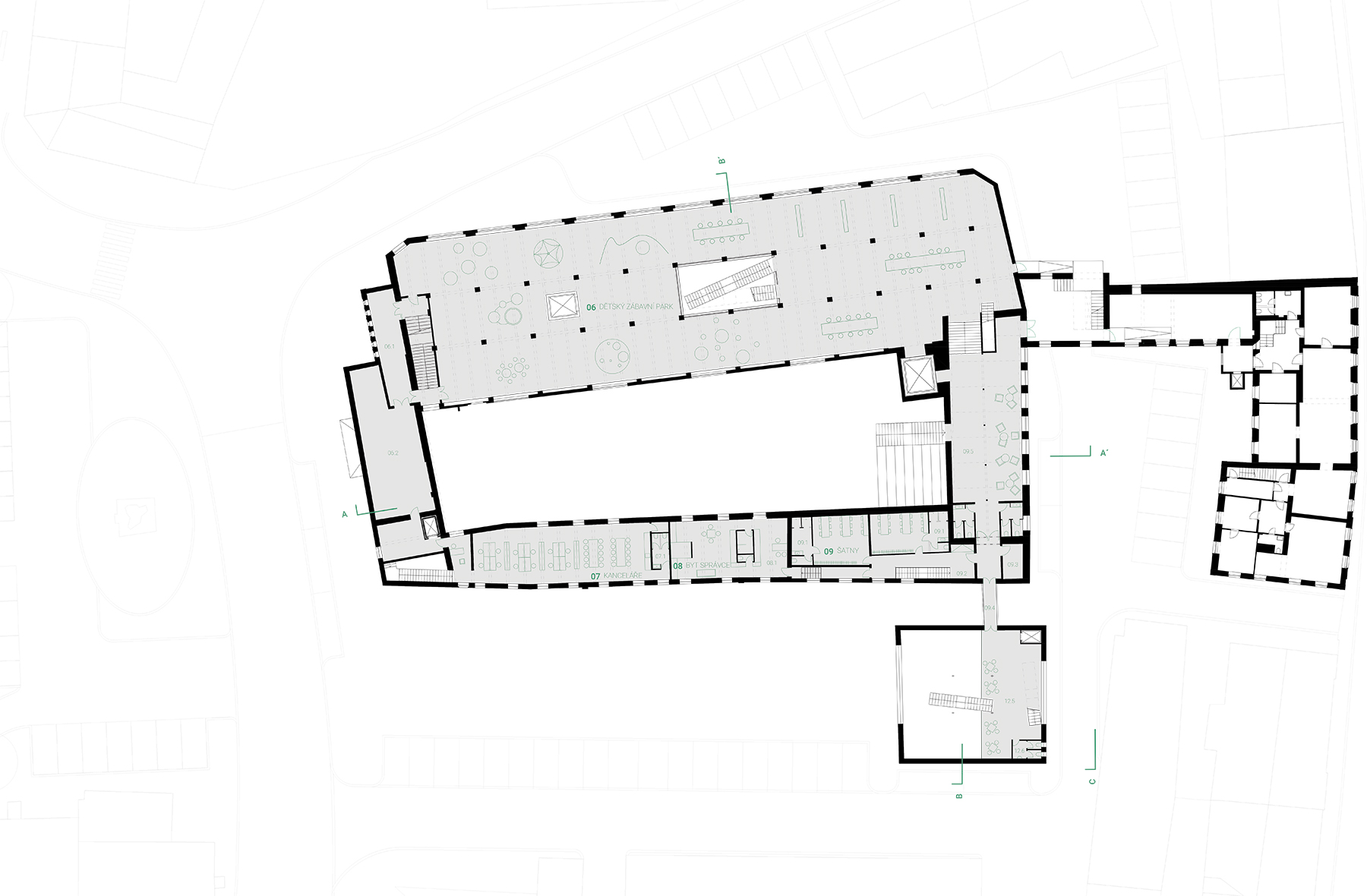 Navrhujeme přiblížit areál stavu z poloviny 20. století, patrného z dobových fotografií, zbouráním nehodnotných administrativních staveb Strojtexu. Neobnovujeme stav však doslovně, vzniká zde nová funkce s novým významem pro město. Špalíček budov s centrálním prostorem a jedním výrazným domem stranou. Toto potvrzujeme zbouráním světlíku, na jehož místě vzniká dvorana s prosklenou střechou, orientační střed, ze kterého se rozbíhají různé expozice. Zároveň však slouží jako sál s jedinečnými industriálními kulisami pro pestré kulturní využití. Ten neposedný dům stranou je loutkovým divadlem, s kavárnou ve foyer. Bez okolků projevuje svůj charakter. Před ním je prostranství se stromy, doplněné lavičkami a kašnami. Mimochodem, továrna bez komína nemůže být – ve předu u silnice je vztyčena socha – poutačkomín! Z nejvyšší stavby – z třípodlažní haly je jedinečný výhled na město a okolní krajinu, jejíž patronkou je nedaleká Zvičina. Nechtěli jsme nechat střechu zapovězenou, proto jsme ji zpřístupnili. Navrhujeme zde terasu pro pořádání večírků, dětské hřiště a trávník na piknik. Prostor střechy vymezuje síť, vytvářející komornější, bezpečnější atmosféru, zároveň budovu třípodlažní haly síť nastavuje a podtrhuje její výjimečnost. Továrna, špalíček budov, se stává svébytným místem se společenským významem nejen pro obyvatele Dvora, ale i pro turisty. Areál továrny je vymezen vlastní dlažbou, stává se ostrovem kultury, odpočinku i zábavy. Zásadní je její otevřenost, aby tepala životem po celý den. Proto počítáme se třemi, respektive čtyřmi vstupy: z náměstí Republiky, z piazzetty před loutkovým divadlem, a z průjezdu z Tylovi ulice a s bezbariérovým přímým napojením na městskou knihovnu. Parter továrny se tak stává volně přístupnou součástí veřejného prostoru města. Zastřešení dvorany je neseno subtilní vzpinadlovou konstrukcí, která generuje pouze svislé síly do stěn a nenamáha je ohybem. Navržená konstrukce je staticky výhodná a materiálově úsporná.