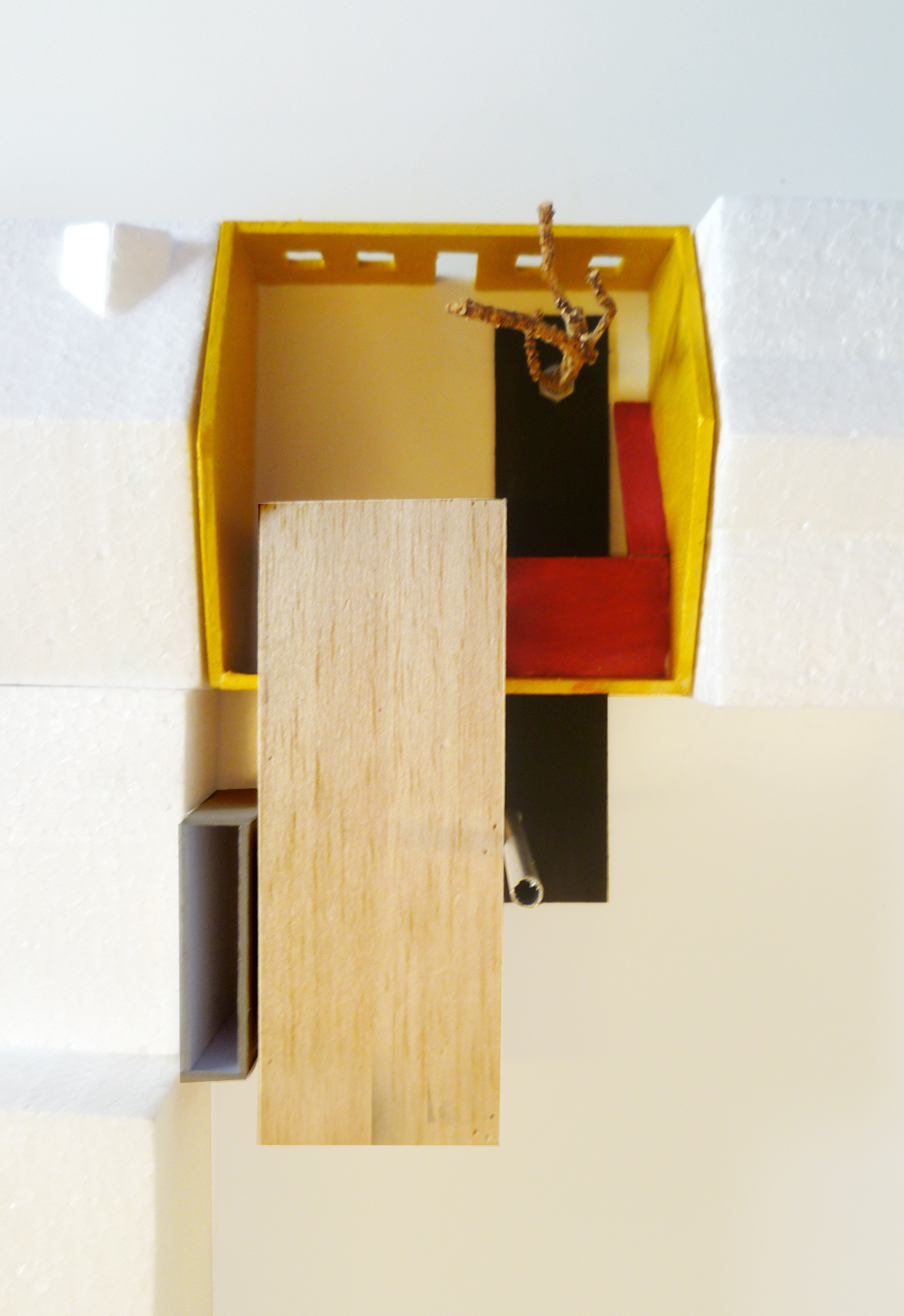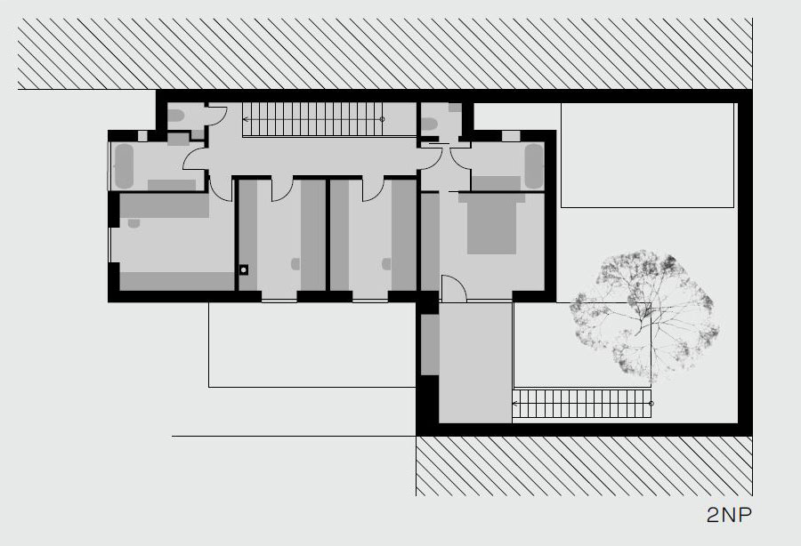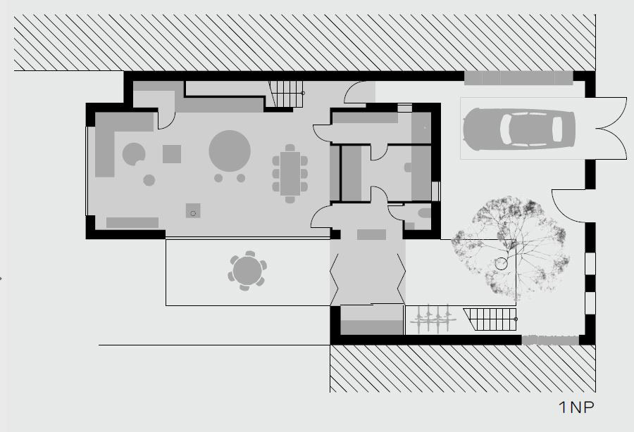 Do dvorku je vloženo parkovací stání, strom, paluba vedoucí do zahrady a schody ústící na terasu v patře domu. Z dvorku vedou tři vchody do domu - dům lze dispozičně měnit. Může sloužit jako rodinný dům pro jednu rodinu, dům s dvěma byty v každém podlaží, případně může být horní byt ještě rozdělen a přibude ještě garsonka. Předsíň je transparentní, nehmotná, s prosklenými stěnami, jenž mohou být odsunuty a předsíň splyne s palubou mezi dvorem a zahradou.