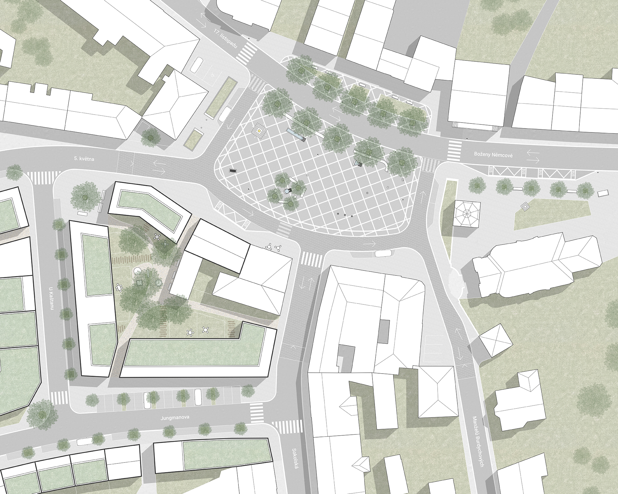 Spolupráce:  Sára Trojovská, Johana Simkovičová, krajinářské řešení: Steiner a Malíková krajinářští architekti, dopravní řešení: Ing. Miroslav Vondřich