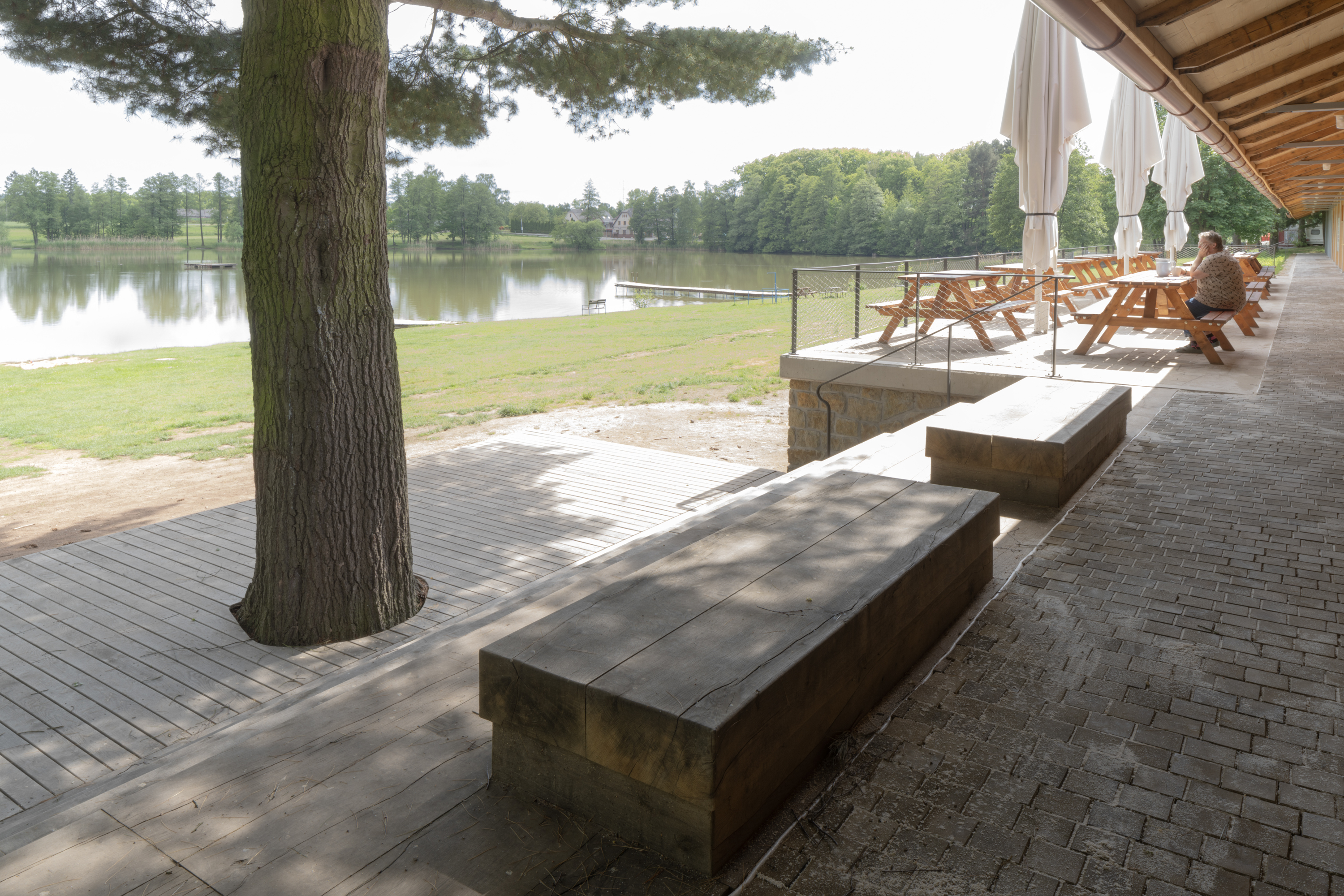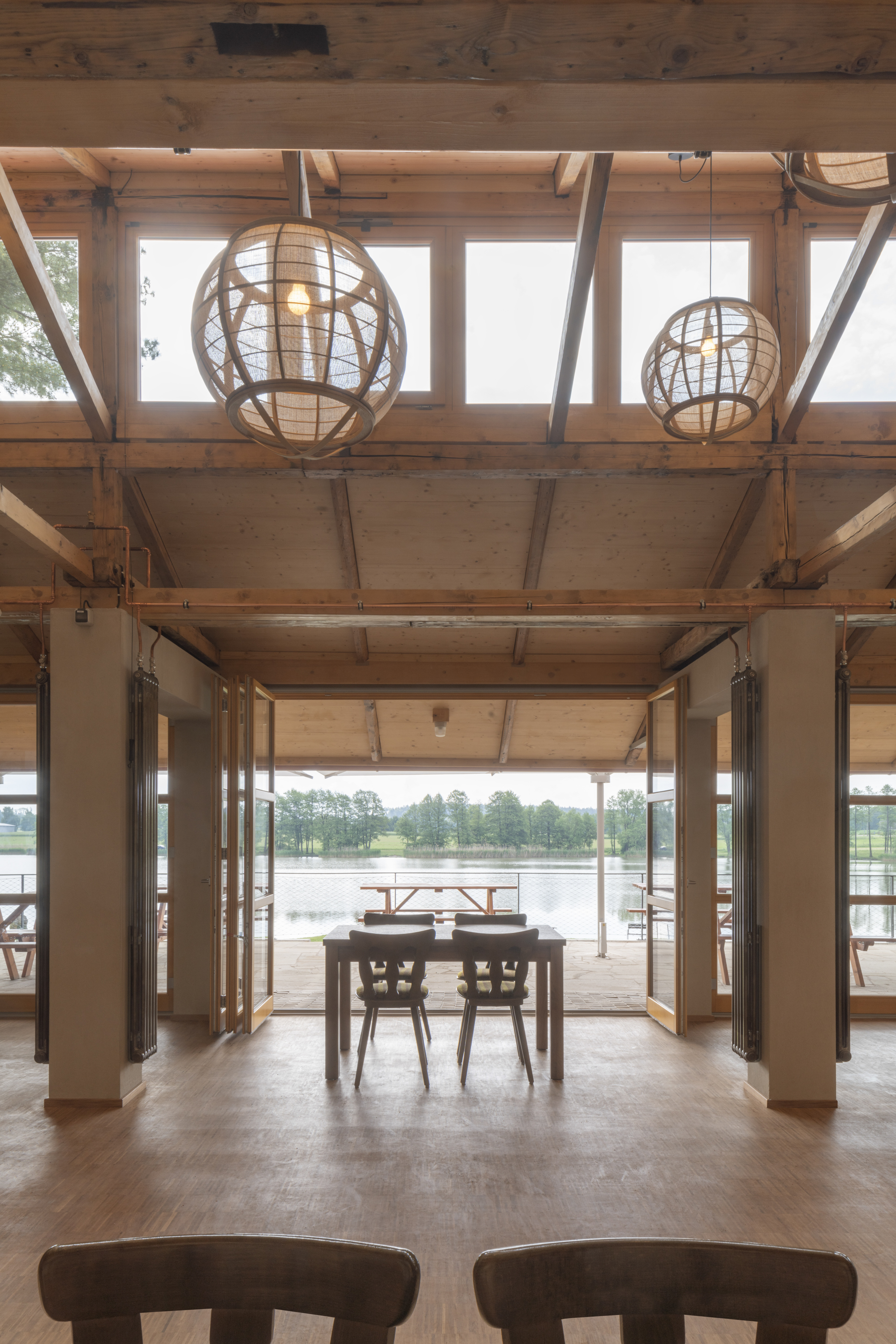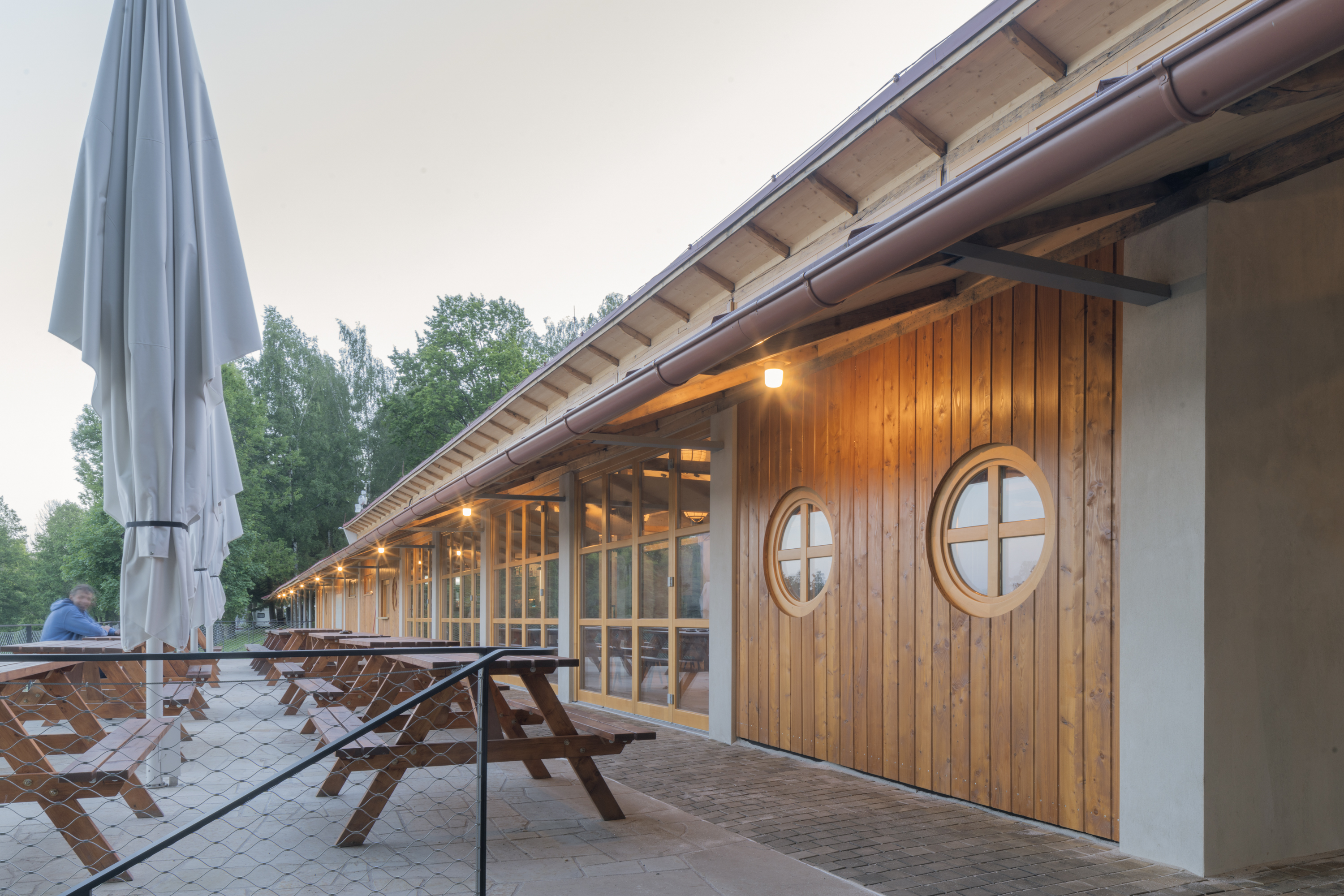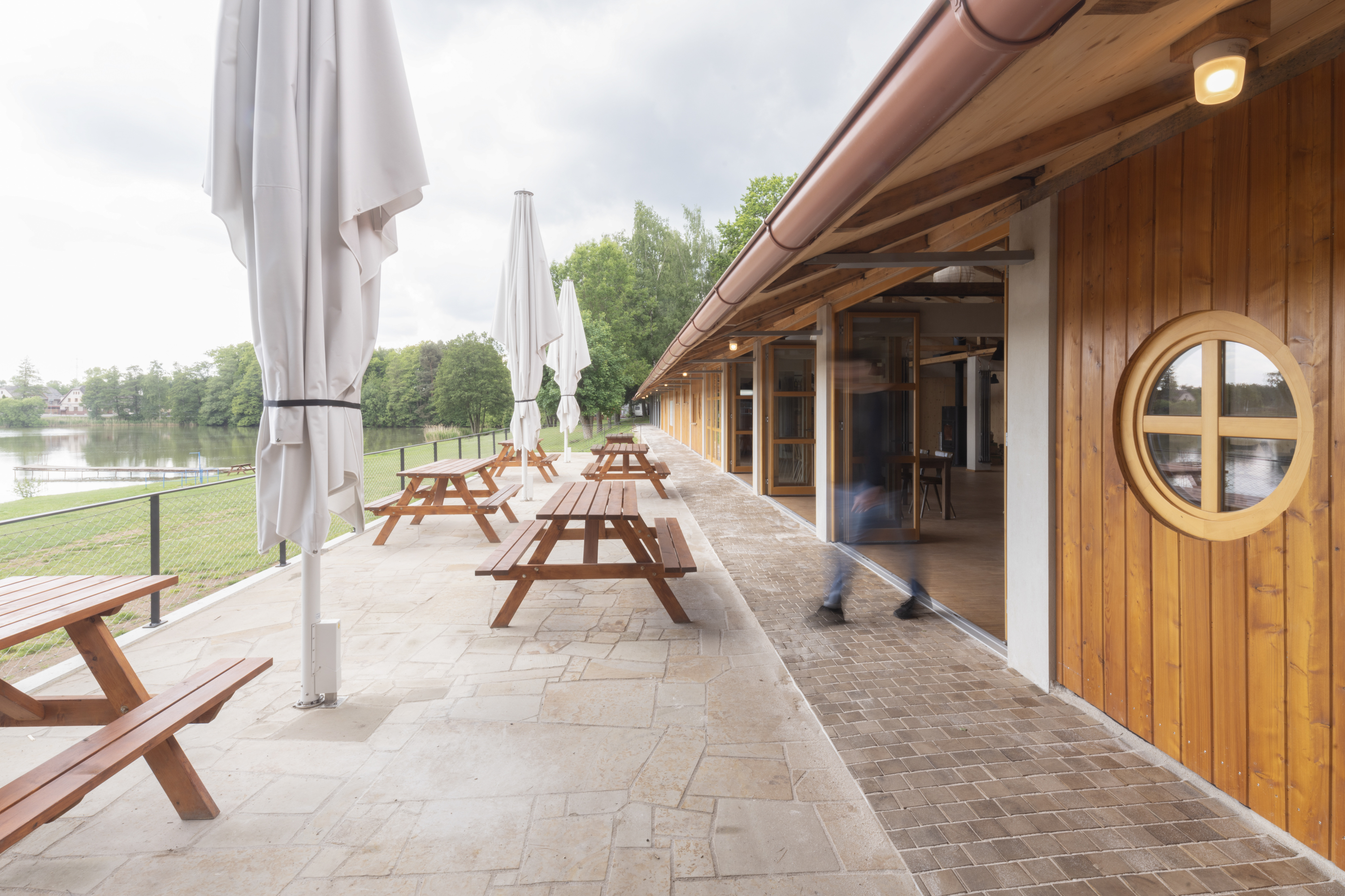 Hlavním určujícím motivem návrhu je propojit dům s přilehlým Brodským rybníkem. V prostorách restaurace jsou proto po celé šíři umístěny skládací dveře, které lze v horkých letních měsících otevřít tak, aby se tento prostor plně propojil s nově navrženou terasou. Dominantním materiálem je dřevo - stěny z CLT panelů, biodeska, smrkový obklad, podlaha v interiéru z průmyslové dubové mozaiky v exteriéru špalíková dlažba. Možnost posezení se rozšírila o pobytové schody s pódiem.