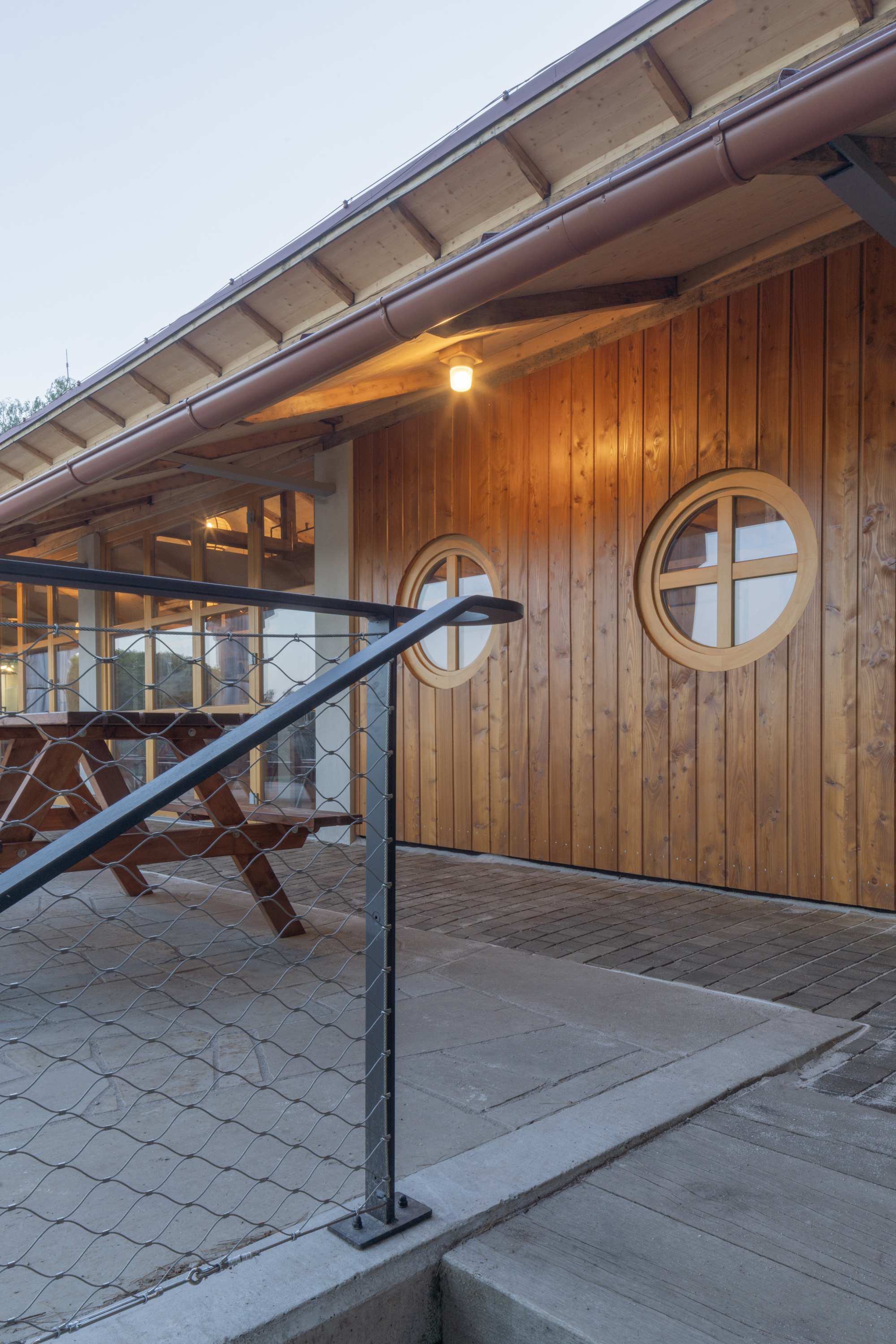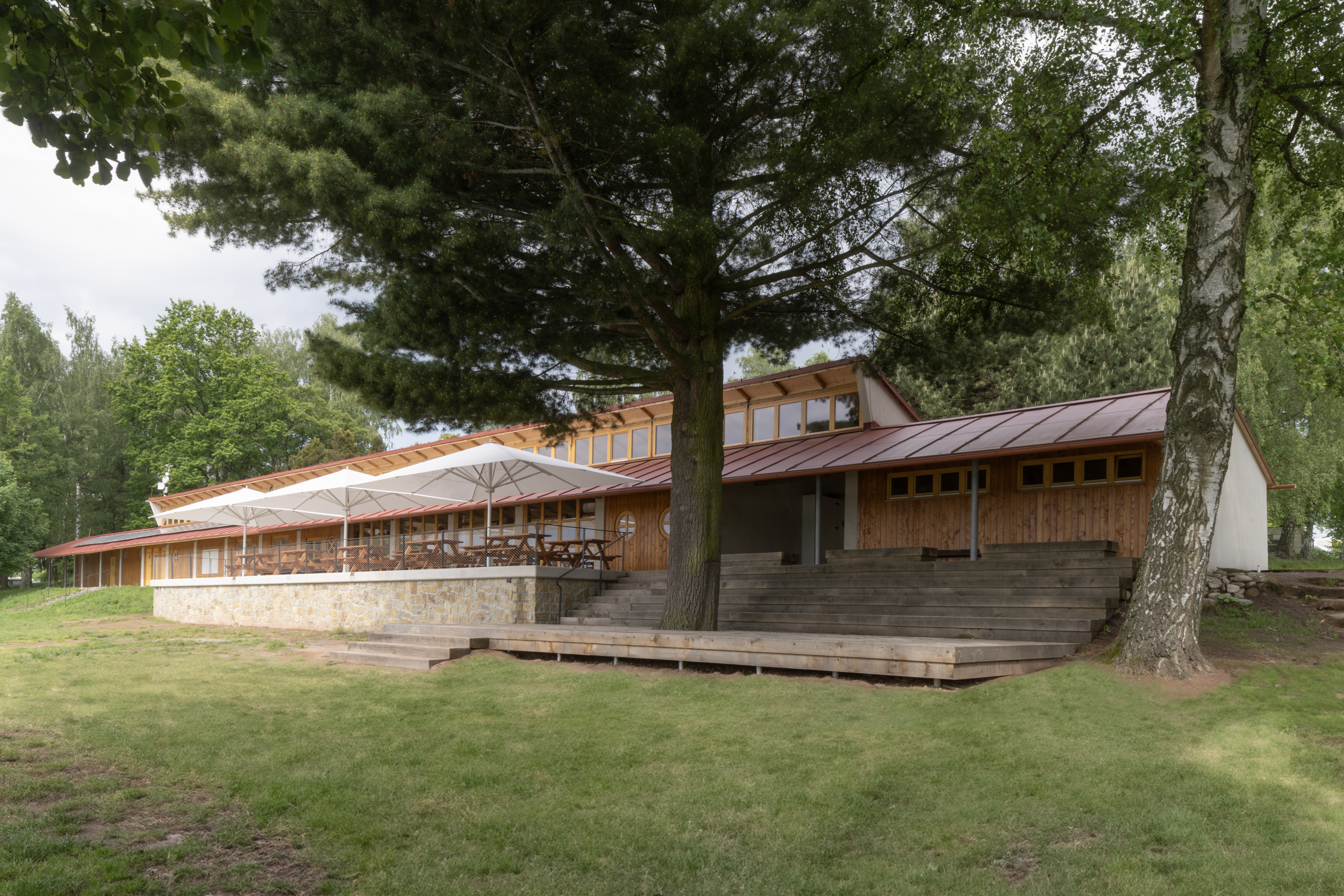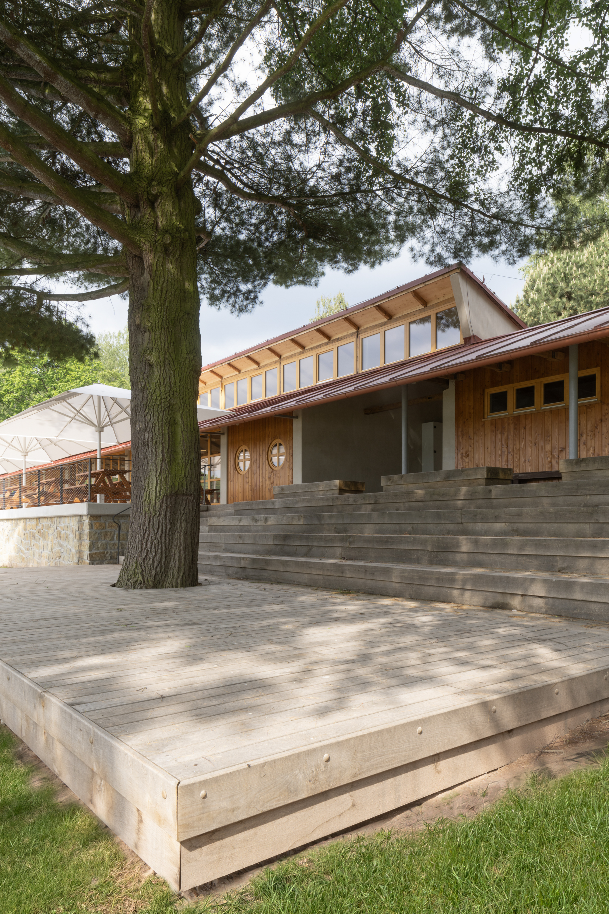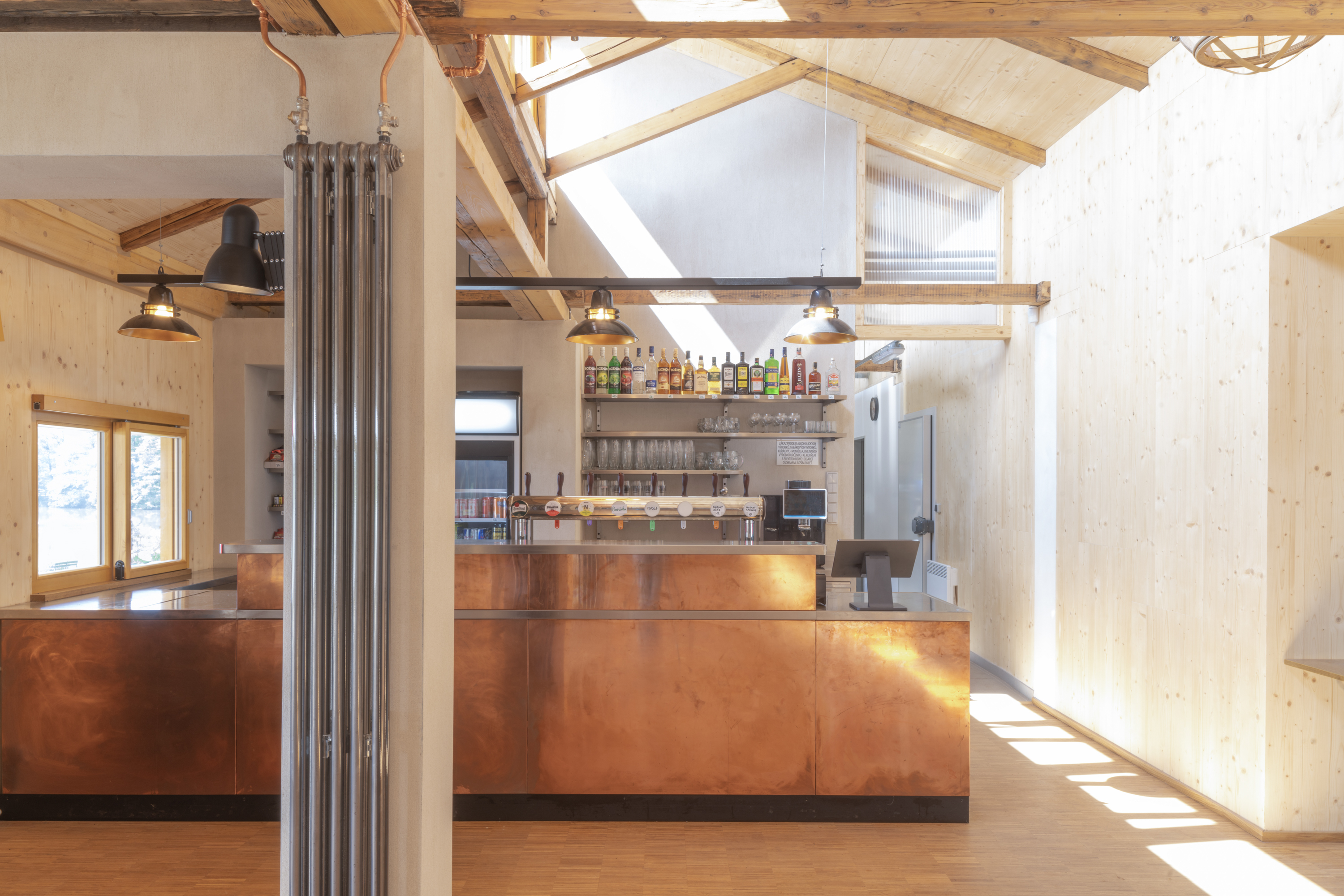 Hlavním určujícím motivem návrhu je propojit dům s přilehlým Brodským rybníkem. V prostorách restaurace jsou proto po celé šíři umístěny skládací dveře, které lze v horkých letních měsících otevřít tak, aby se tento prostor plně propojil s nově navrženou terasou. Dominantním materiálem je dřevo - stěny z CLT panelů, biodeska, smrkový obklad, podlaha v interiéru z průmyslové dubové mozaiky v exteriéru špalíková dlažba. Možnost posezení se rozšírila o pobytové schody s pódiem.