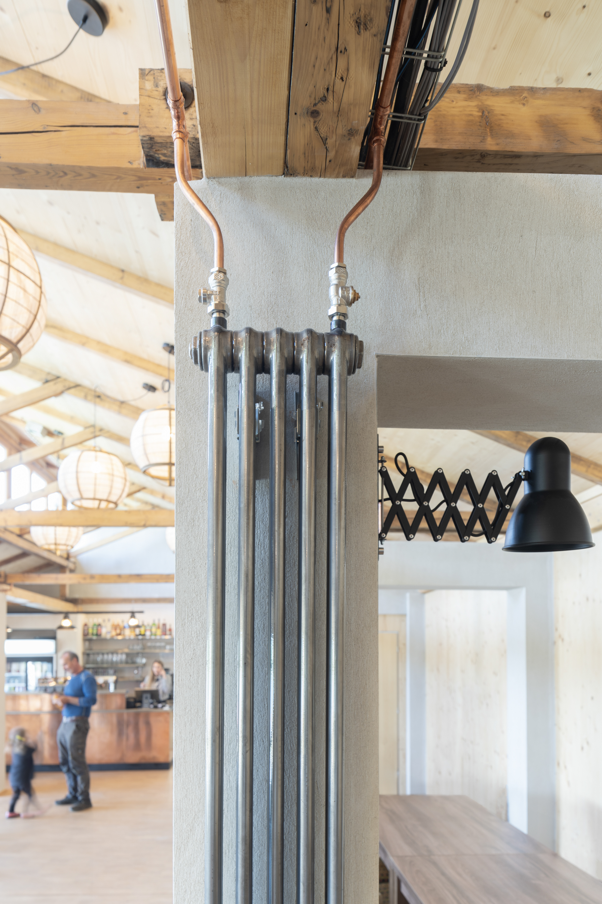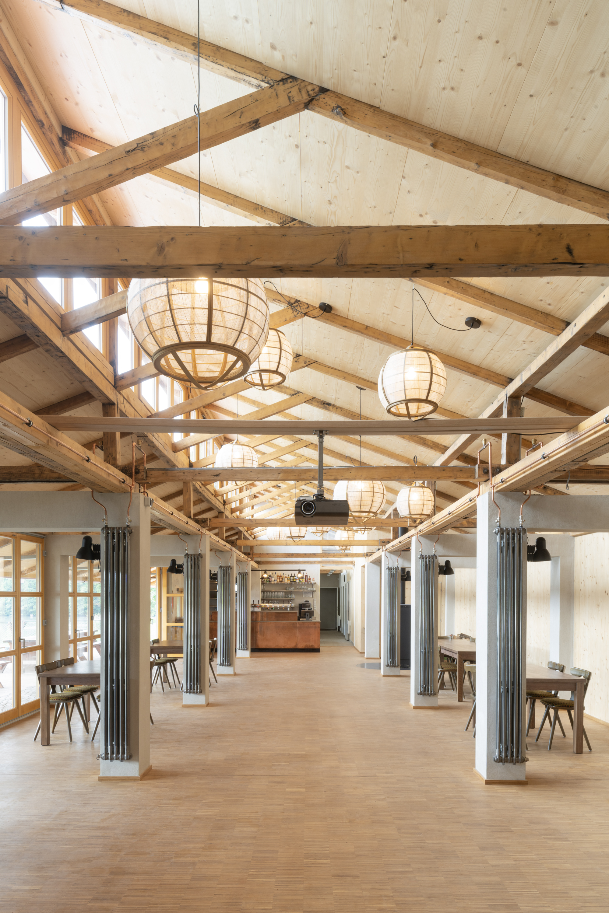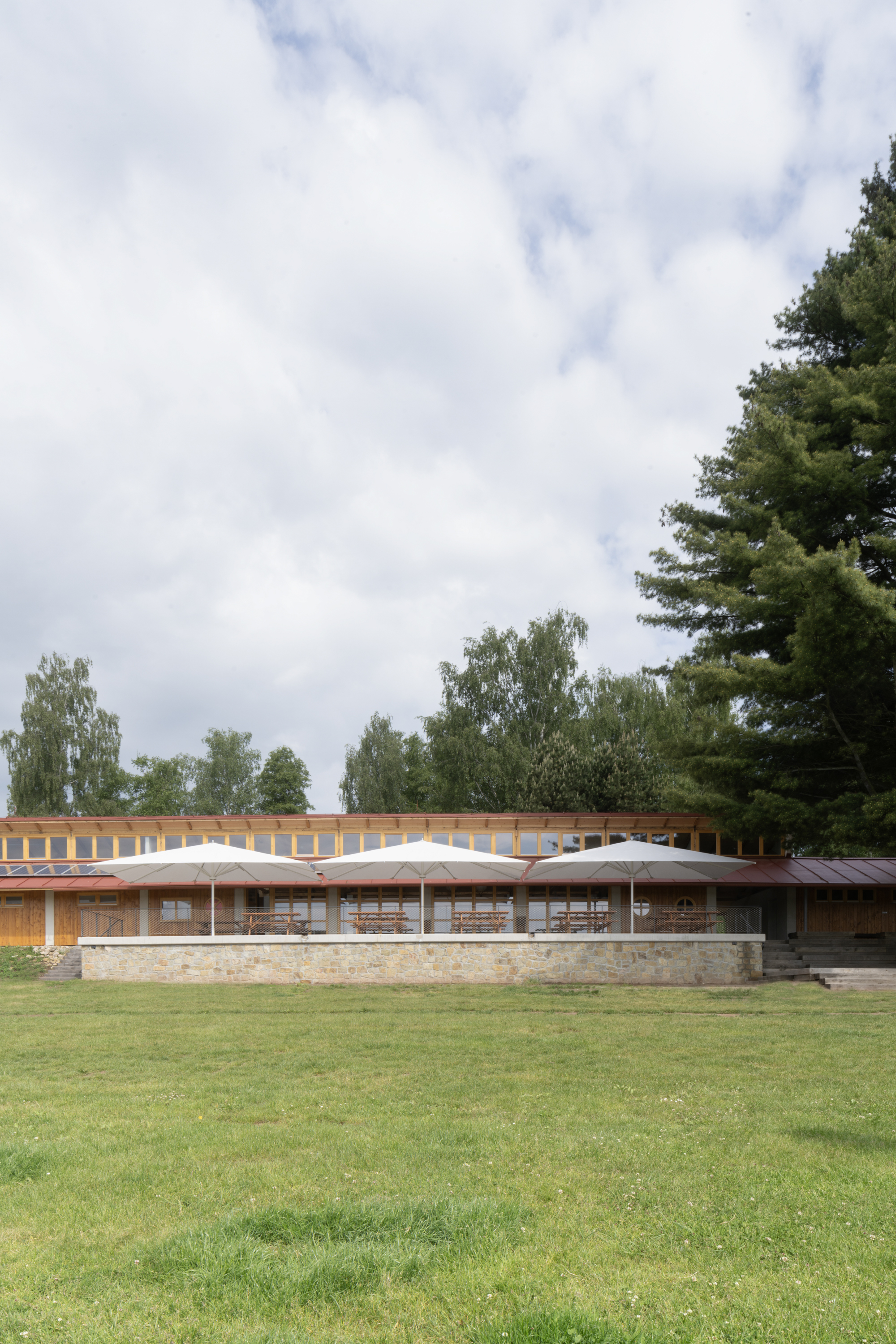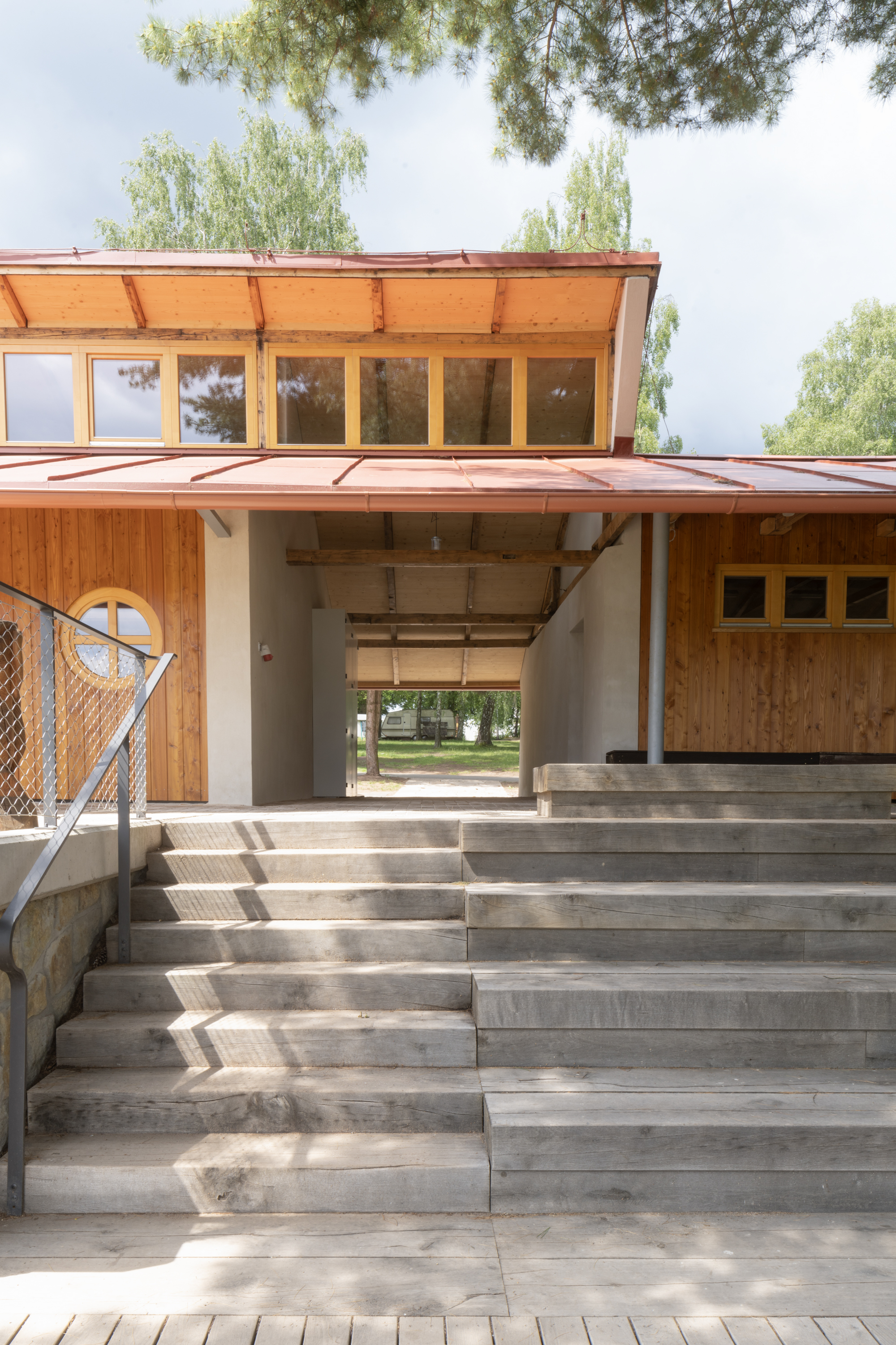 Hlavním určujícím motivem návrhu je propojit dům s přilehlým Brodským rybníkem. V prostorách restaurace jsou proto po celé šíři umístěny skládací dveře, které lze v horkých letních měsících otevřít tak, aby se tento prostor plně propojil s nově navrženou terasou. Dominantním materiálem je dřevo - stěny z CLT panelů, biodeska, smrkový obklad, podlaha v interiéru z průmyslové dubové mozaiky v exteriéru špalíková dlažba. Možnost posezení se rozšírila o pobytové schody s pódiem.