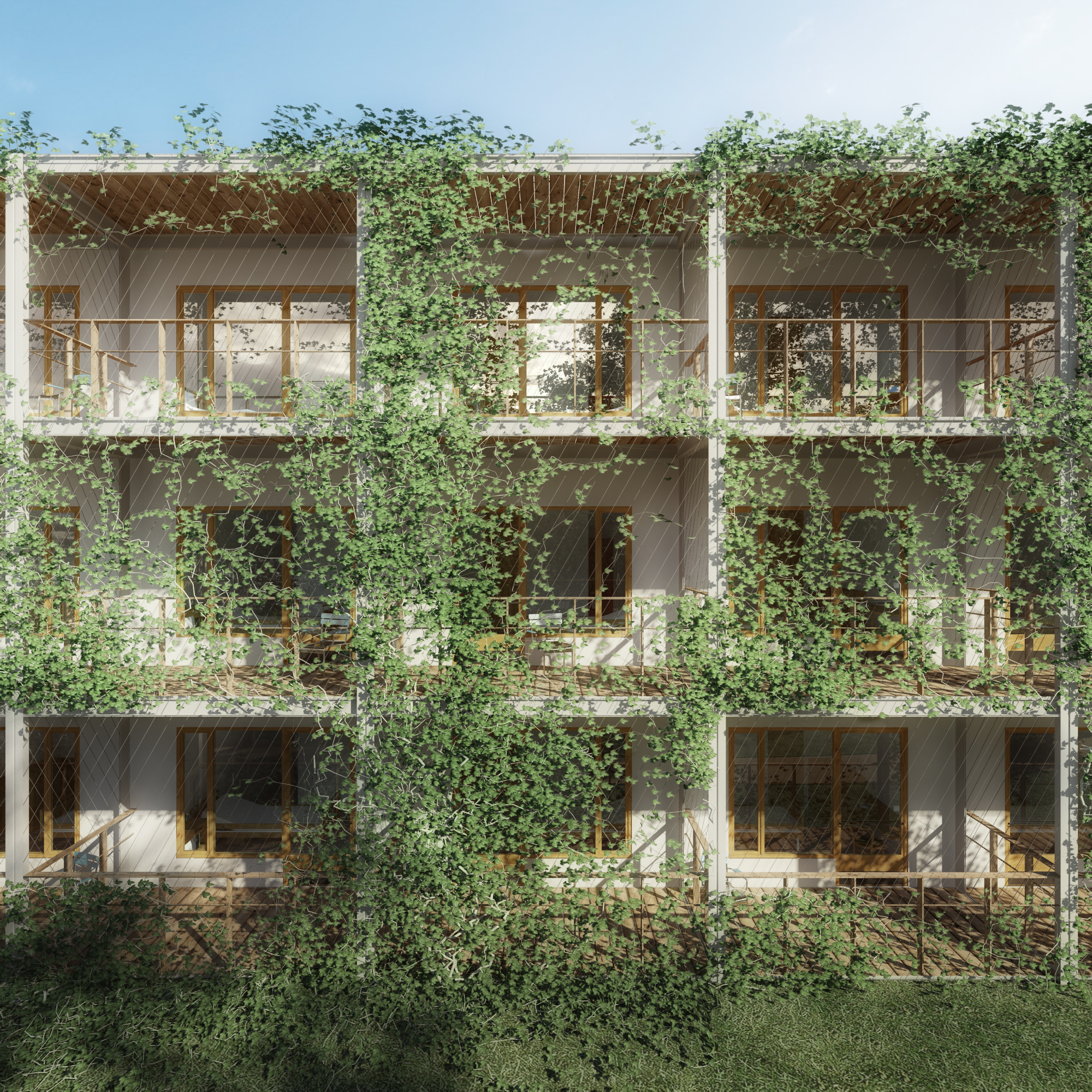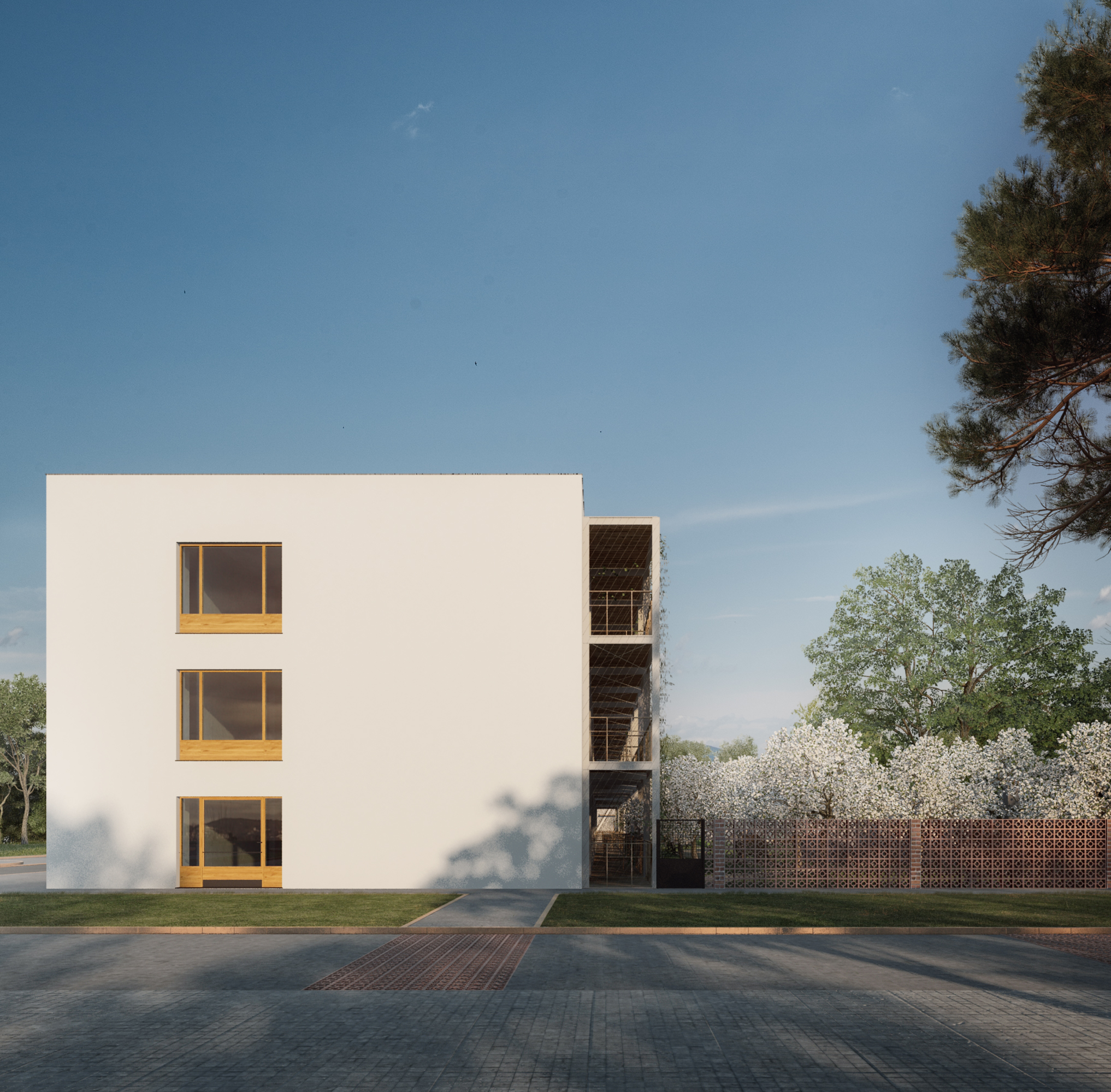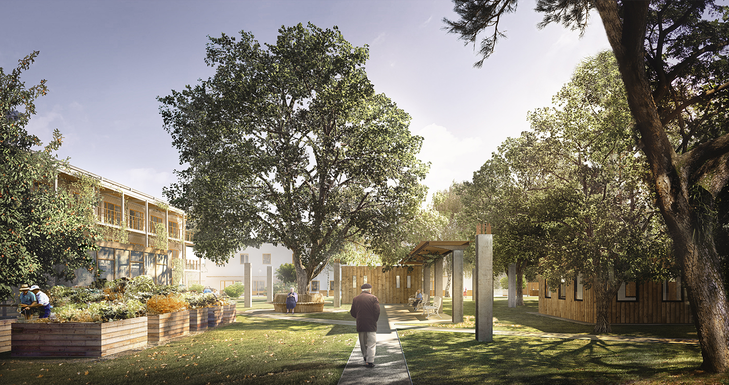 Na parcelu, která je takto uvedena do souvislostí jsou umístěny 2 budovy. Rozdělení do dvou budov vychází z odlišných požadavků na režim jednotlivých částí. Spojování ústavní péče a asistovaného bydlení by nejspíše poškodilo jednu, nebo obě skupiny klientů. Domy se orientují do veřejného prostoru. svými objemy vymezují velkou zahradu, která je klidným a přátelským místem uprostřed rušné a neosobní čtvrti. Vstupy do domů se orientují do vnitřní ulice, která propojuje veřejný prostor a zahradu. Společným prvkem obou domů je možnost přímého přístupu z ubikace do osobní malé zahrádky.