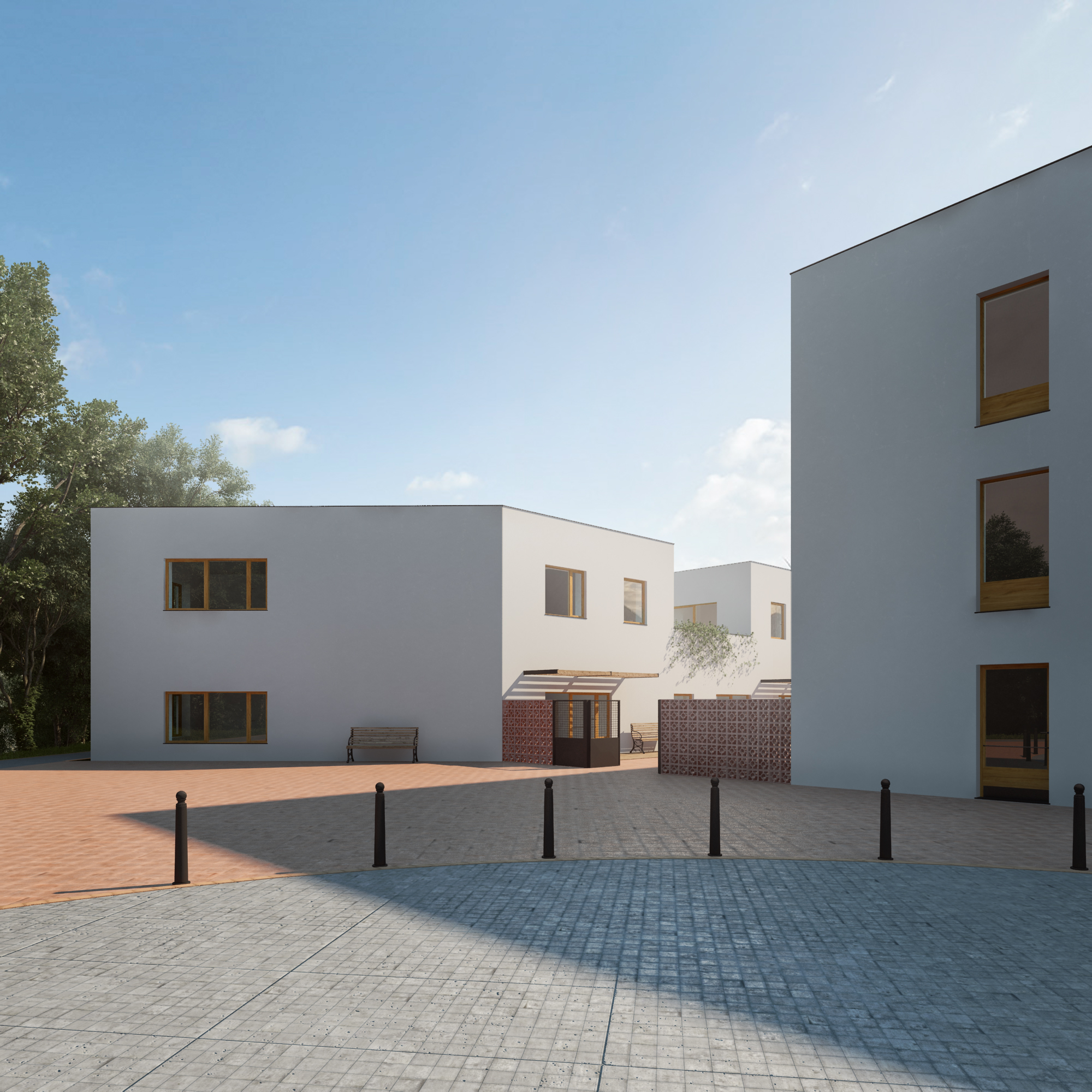 Prvním bodem návrhu je legitimizace vybrané typologie v místě určení. Naší snahou je celému místu dát nový řád, aby se v něm lépe orientovali nejen budoucí rezidenti, ale i jeho stávající uživatelé. Nově navržený předprostor těsně přiléhá ke Kozí stezce a pěší cesta k němu je zdůrazněna kaštanovou alejí. Domov tímto způsobem vítá příchozí. Do vydlážděného předprostoru je možné dostat se i autem, a to navrhovanou ulicí k zelenému pruhu ose celého území.